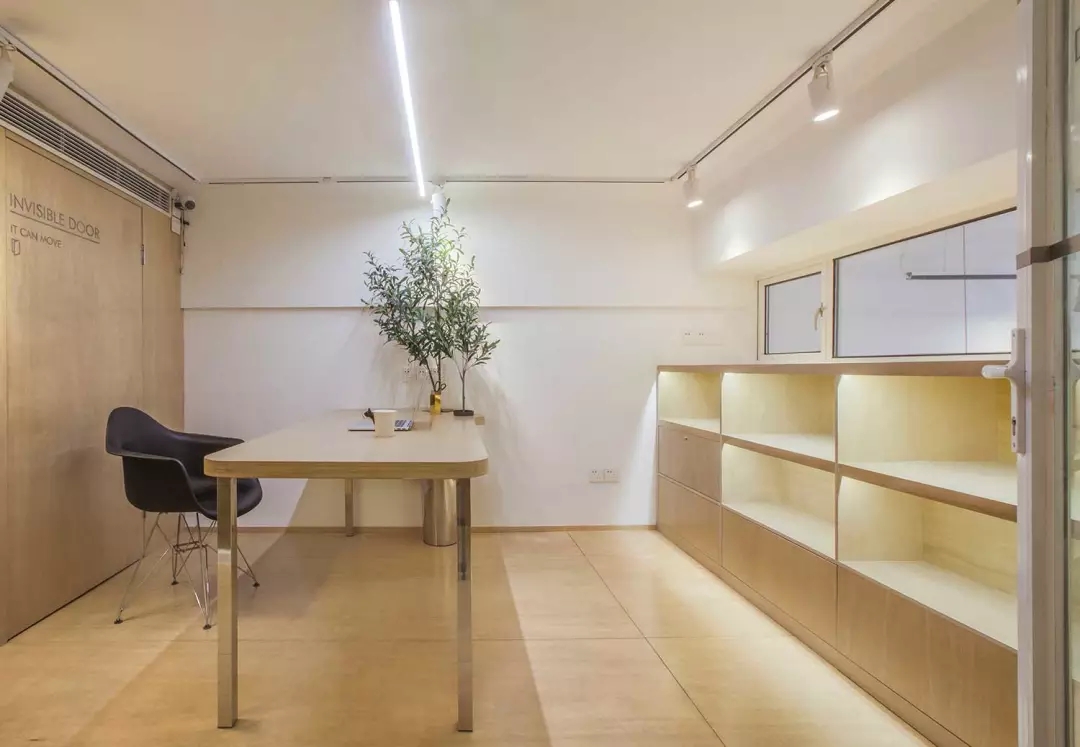 辦公桌與樹的結合,成為了整個空間的內景觀,也與外面的綠色形成呼應,消減以往辦公的緊張氛圍。整墻的書架也不甘無趣,在實用的框架下,產生一絲波動的起伏,如同山崖,如同坡面。
