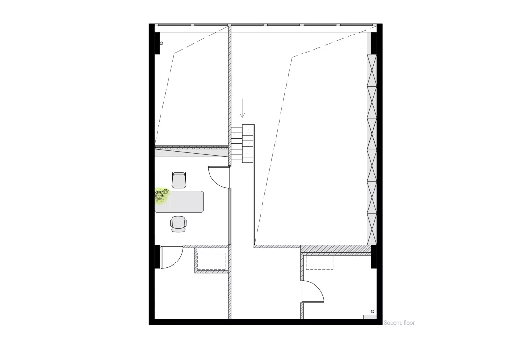 同時我們希望有一個張別具一格的會議桌,但是會議桌極強的功能性使得難以去進行改變。于是,會議室空間本身的形狀缺陷成了這張桌子想法的起點。由于避讓入口玄關,會議室空間有一個角是切掉的,墻壁是斜著放置,如果是長方形的會議桌,就必然在這個斜墻前造成使用空間不夠缺陷,無法坐人.所以就產生了一個平行四邊形的會議桌,斜邊與空間的斜墻平行,也讓整個斜墻前的空間可以坐下一個參會者,再嵌入一些小草,一張獨特又實用的會議桌就出來了。