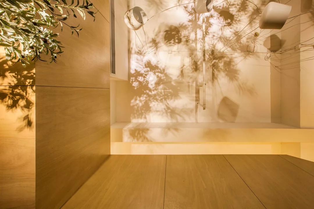 功能融于樂趣與創(chuàng)意,兩個空調的回風孔也不能放過,市面上的百葉口為了實用而完全無法融入環(huán)境。由于吊頂也屬于木質體塊,所以經過試驗,一個充滿漸變的點陣圖形,解決了這個問題,不同規(guī)格的開孔器進過精心布置并開洞,讓空間回歸純粹與樂趣。