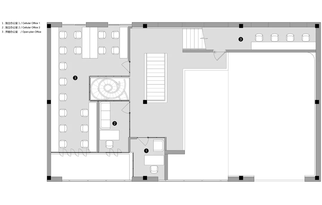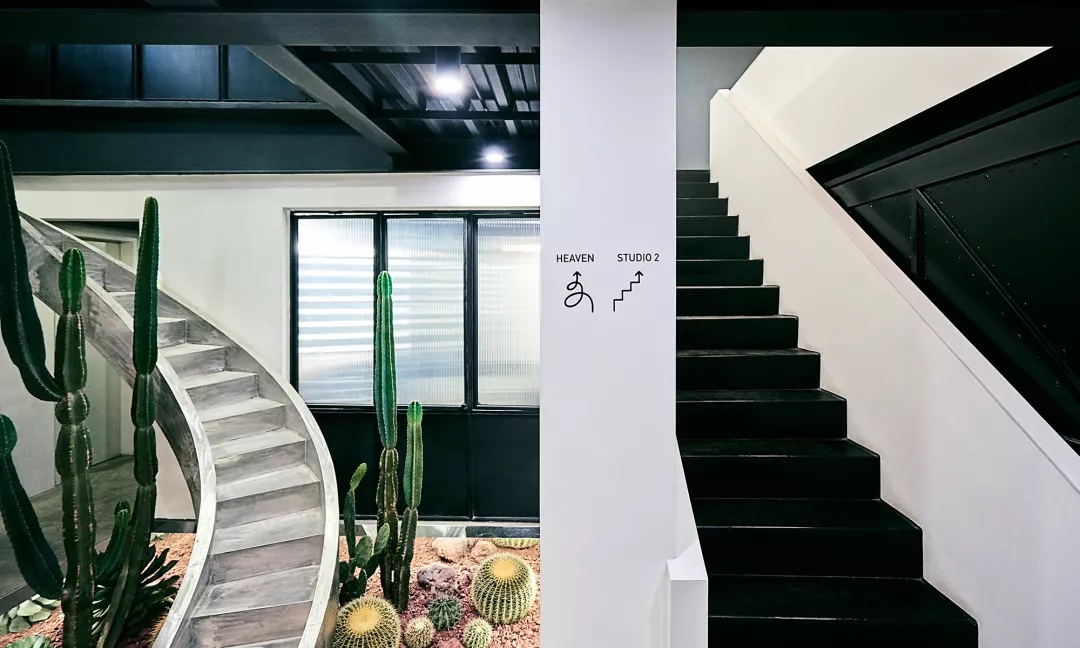 ASTUDIO攝影工作室位于CBD東側菁英谷文創園內,整體的設計風格融合了粗狂工業風和現代簡約風。原有建筑為雙層的廠房空間,這種大空間非常適合拍攝的需求。攝影師希望把這個大空間改造為兩個相對獨立的拍攝區,并且有各自獨立的化妝間和出入口,從而可以同時進行兩場獨立的拍攝。UUA將原有的二層建筑在豎向上改造成為了三層的空間,其中第一層包含接待區和1號拍攝區,第二層整體為辦公空間,第三層是2號拍攝區,這種豎向上的分區保障了兩場同時拍攝的獨立性。