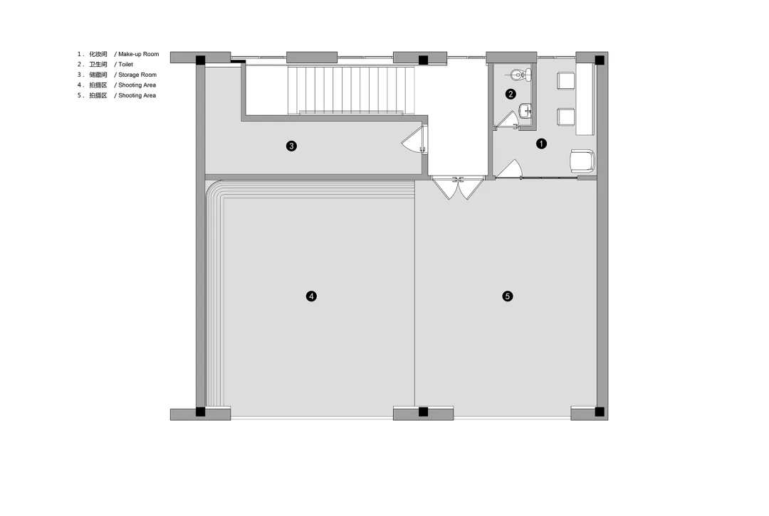 ASTUDIO攝影工作室是一個多功能的復合空間,UUA把拍攝、化妝、接待、辦公、會議、休閑等多種功能有機地融合在這個通高的廠房之中,空間緊湊又富于變化。拍攝區為最重要的功能單元,由于需要足夠的長寬高空間來滿足設置無影墻、布景布光以及拍攝距離等需求,所以設計師將一層的一半劃歸為1號拍攝區,保留雙層通高的空間形式;另一半則加建出雙層空間,其中一層作為接待,二層作為辦公。廠房的三層因為原本具有足夠的層高,因此被設置為2號拍攝區。