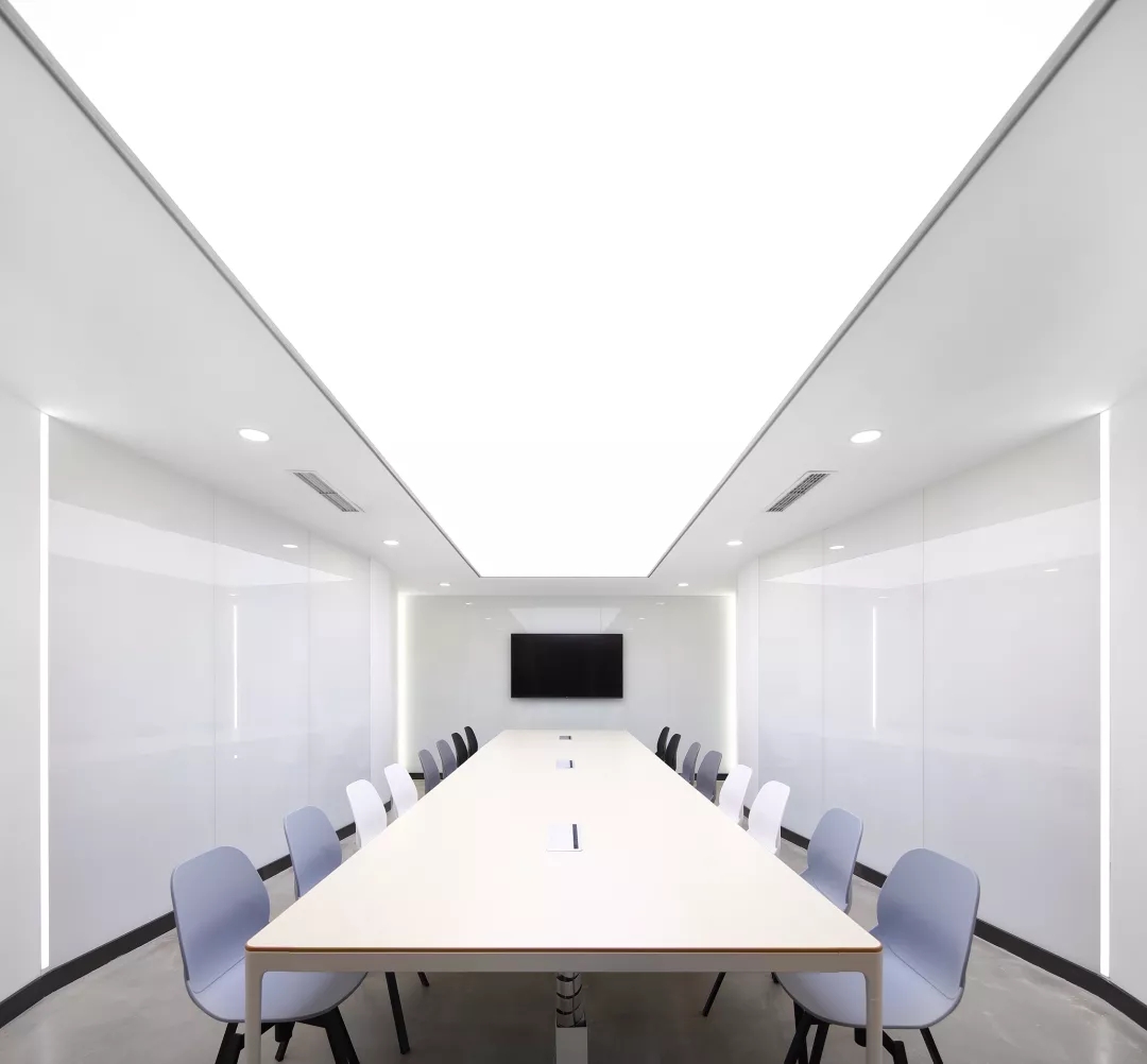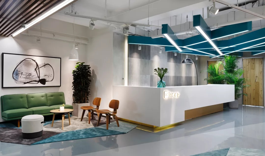 靠近電梯入口的前臺通過頂部的放射狀線條設計產(chǎn)生視覺延伸感,兩側區(qū)域通過軟裝陳設實現(xiàn)多層次的空間,靈活滿足接待、等候、會議及咖啡茶點的各種需求,員工和來訪人員各取所需互不干擾。