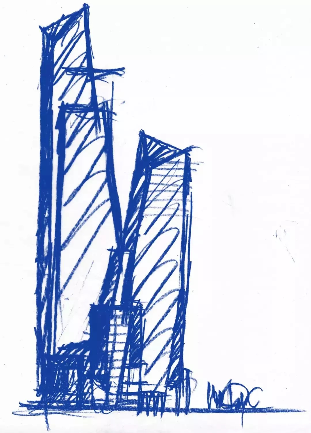 KPF創(chuàng)始人及設(shè)計執(zhí)行總監(jiān)William Pedersen表示,“我們力圖通過10和30號樓的形態(tài)去表達一種自然的力量。兩棟塔樓向上升騰形成類似于地質(zhì)形態(tài)水晶石一般的外形,相互致敬,構(gòu)成一種有如都市舞蹈般的生動的城市空間關(guān)系”。