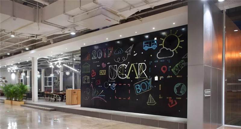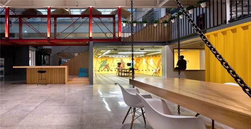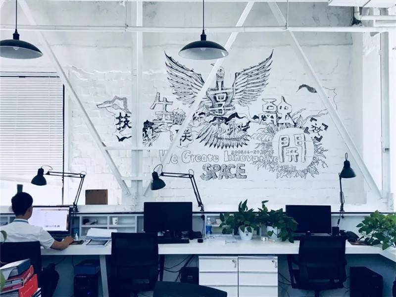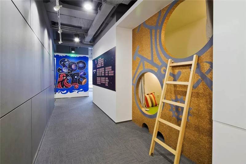 比如這張圖,也是華米科技北京的辦公室,用奧松板開兩個洞,精巧可愛的睡眠艙趴在墻上,利用兩個洞把它組成了自行車的輪廓,超萌的壁畫使墻面不再單一,色彩的對比更加直觀,同時用太空艙的形式增添趣味點,不論是做設計師還是做工匠,都要秉持設計的理念去進行選材和制造工藝,把握好每一個細節。