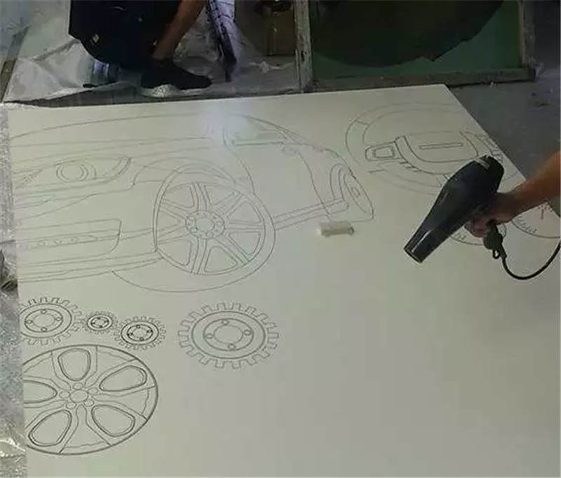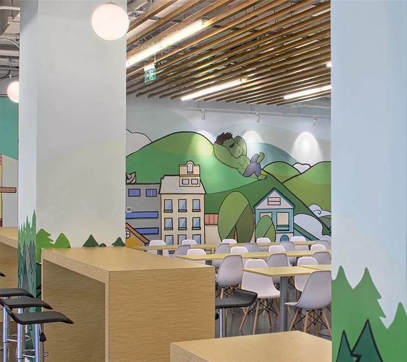 這幅畫是最初設計的圖案,圖形繪制的大粉筆畫,它的好處是可以定期的更換,就像黑板報一樣來制定不同的主題,就員工的活動,員工的留言簽字都可以在這體現,如同活的展示墻。