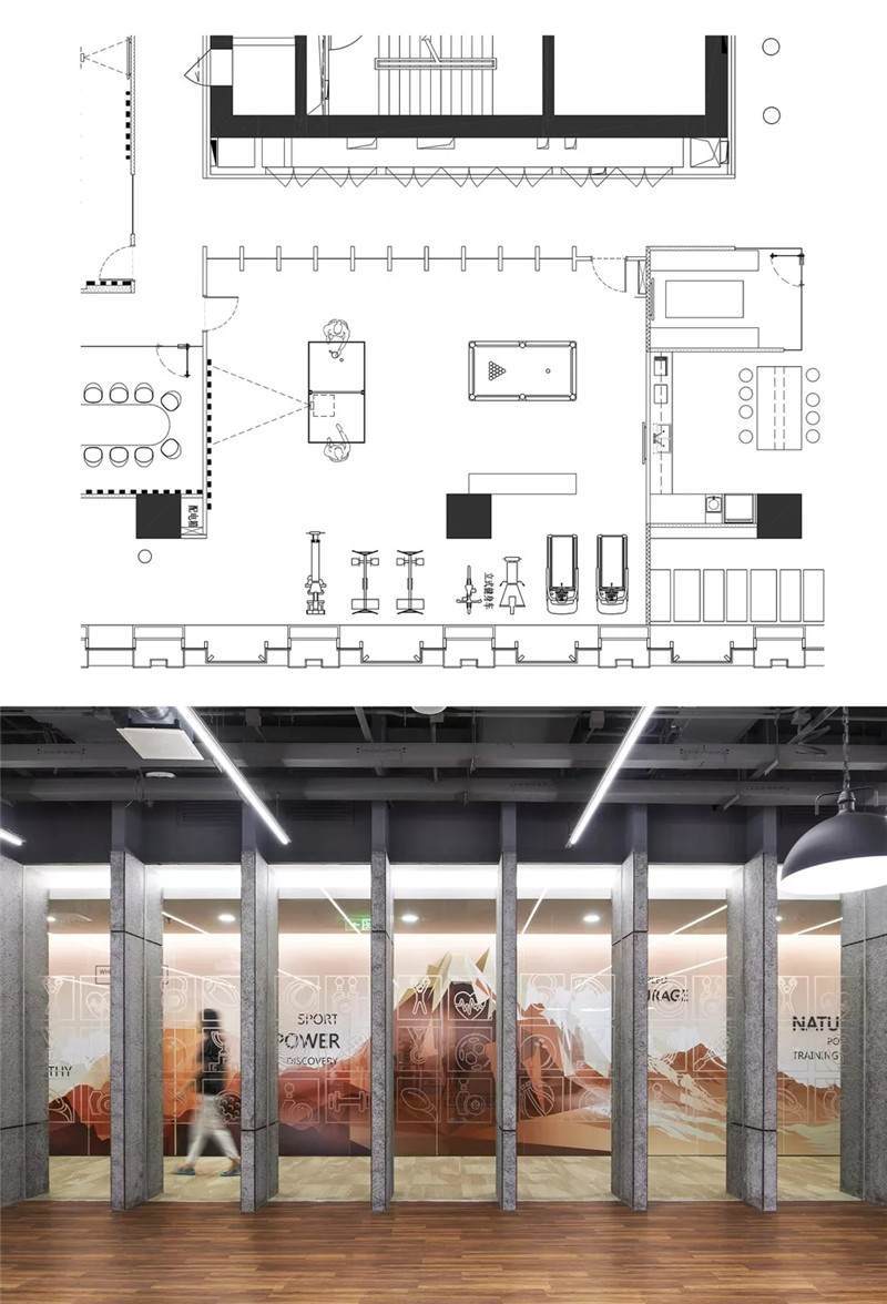 健身房采用的是隔墻類的隔斷,透過隔墻隔斷玻璃能看到核心筒的走道,核心筒的墻面是一幅大型的噴繪畫,結合立體字,畫面比較震撼,再通過健身房往外看就會產生非常豐富的層次感。玻璃隔斷上也有小的磨砂圖案,形成了戲劇性的效果,使空間的層次更加突出。