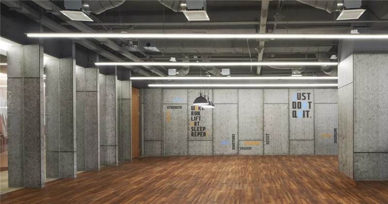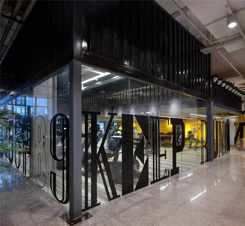 整體空間設計多層次,所以它的貼膜采用黑色字母來呈現健身區的氛圍。