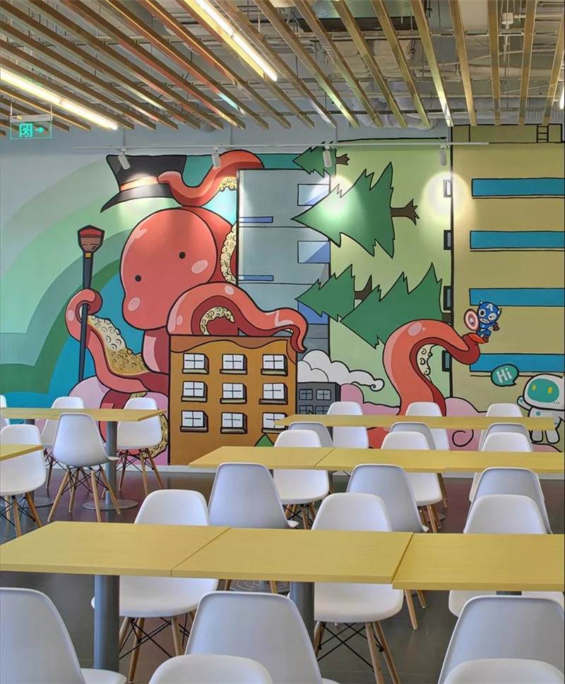 空間氛圍不同,所以圖形裝飾也會因地制宜的改變,用暖色更動態的感覺。繪制的粉筆畫,可以定期的更換,像黑板報一樣制定不同的主題,它就是一面活的展示墻。