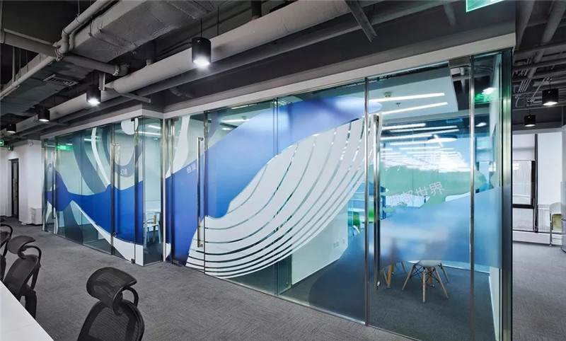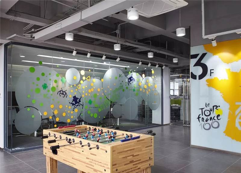 第二張中可以看到,桌上足球,這一張是會議室的玻璃貼膜,最初設計的都是一些彩色的圓點,但是做完后太通透,起不到遮擋作用,所以現場臨時在玻璃的內側又加了大型的磨砂圓,就有兩層疊加到一起的圖形,磨砂與色彩組合在一起,效果豐富有層次。