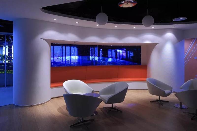會議室電視的背景墻是手繪的墻面,弧形的玻璃采用了豎線稀疏的玻璃貼膜在起防撞的作用,同時與后面的大畫面也能產生一定的聯系。