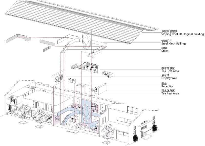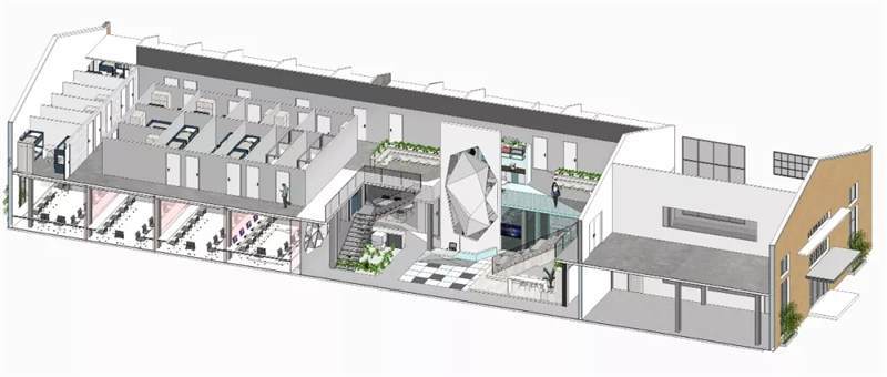 本案位于上海市寶山區蘊川路6號智慧灣科創園,原建筑為3D打印的廠房裝修,室內最高凈高9米,最低6.4米。此空間除原建筑結構墻外,無任何結構柱與墻體,因此為了更充分合理的利用空間,設計師構筑了二層,根據嗶哩嗶哩電競的辦公功能訴求,布置空間功能區,即1F分布前臺區、會議區、茶水接待區、賽訓室、開敞辦公區、導播室。2F分布就餐區、住宿區、導播室等空間。