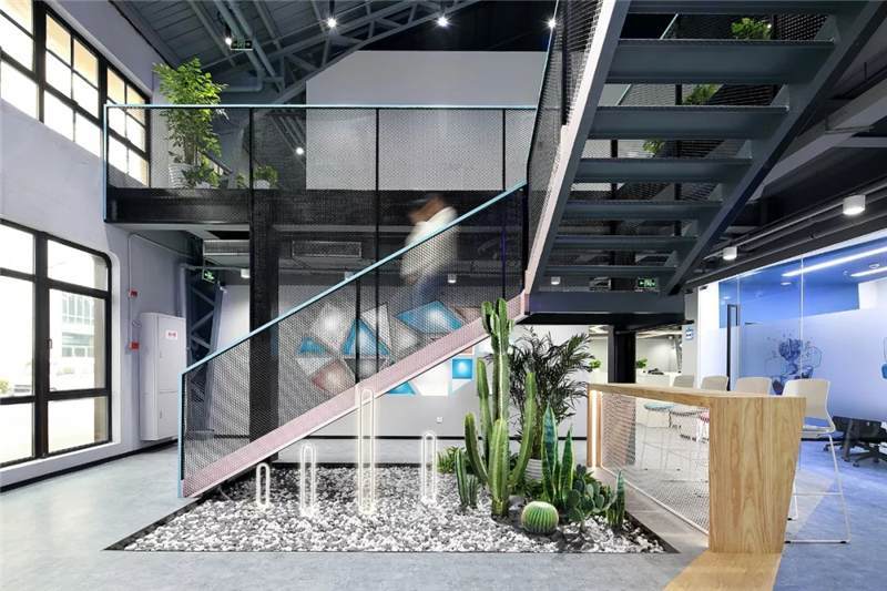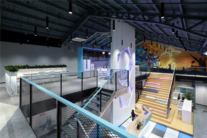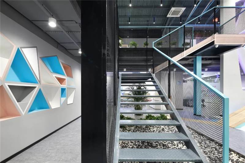 前廳左側,設計結構簡單的樓梯,運用與二層欄桿材質相同的鐵絲網扶手,使得兩層樓形成一個工業風的整體。側邊與扶手點綴以藍色和粉色的噴漆,樓梯下布置用鵝卵石,仙人掌和燈光組成的景觀裝置小品,讓整個電競空間生機勃勃,平添許多年輕活躍的氛圍。此處木飾面的吧臺延伸到地面再與前臺、右側大臺階連接形成一個整體,使整個空間更加連貫統一。