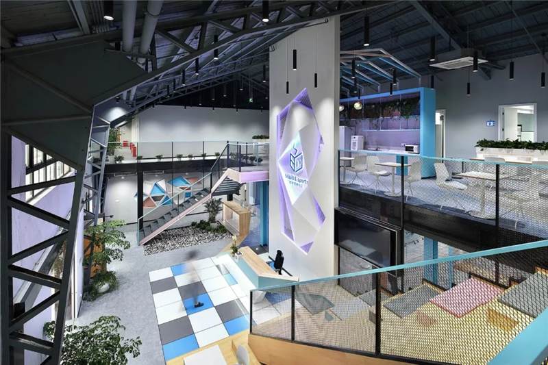 設計師在設計過程中考慮到空間使用群體均為15周歲左右年輕賽訓者,需有活躍氛圍,體現青春活力和競技精神。因此我們提取嗶哩嗶哩電競的主要元素,運用三角形幾何體的設計,用色上點綴LOGO藍粉色彩,黑白灰為輔更加凸顯企業文化,使空間與原始建筑結構更加協調。