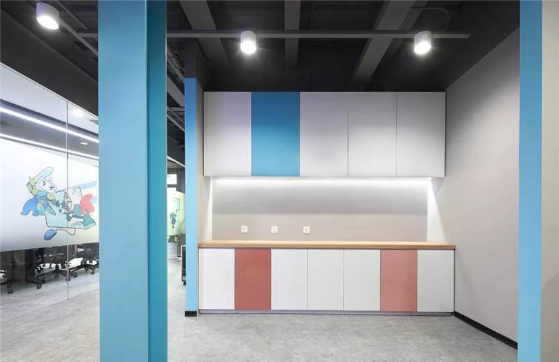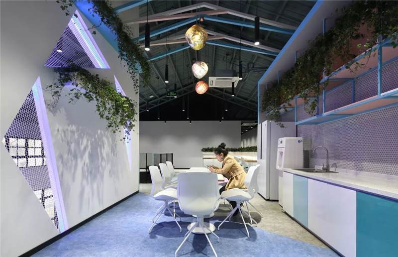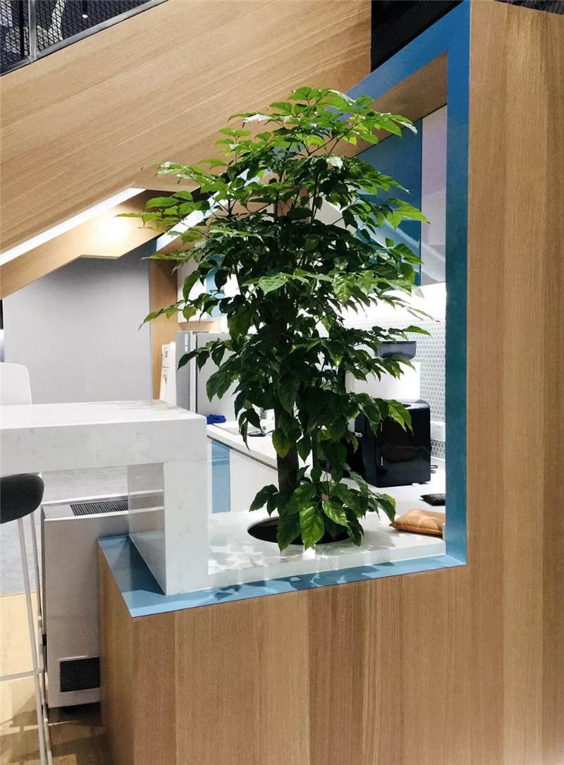 吊柜打破了傳統的平開門形式,使用開放的彩色盒子,實用兼裝飾功能。另外設計師還根據層高差,在茶水區頂部設計三角形格柵,茶水柜上方及背景墻后方,點綴綠植,使整個空間富有生態氣息,在光影的效果呈現別樣風采。