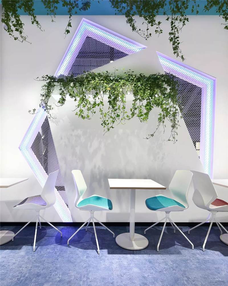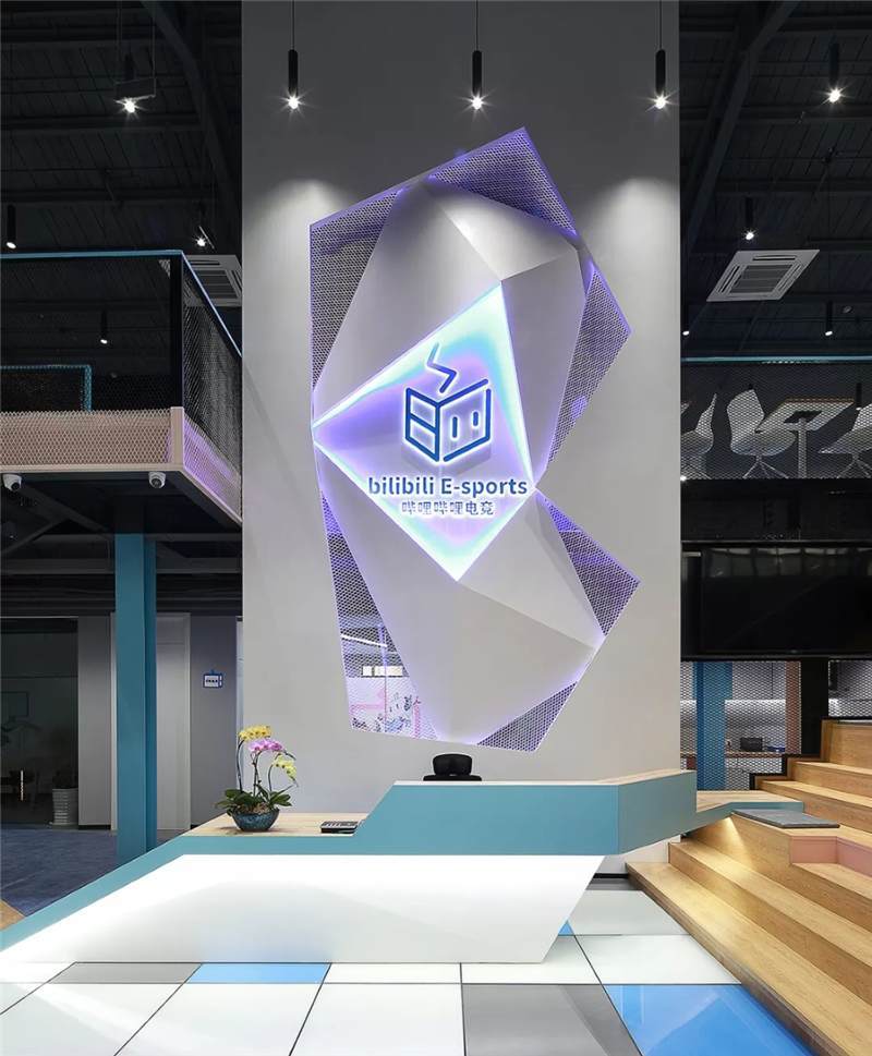 前臺接待區利用建筑結構挑空空間的優勢,塑造9米高的具有未來雕塑造型藝術感的LOGO背景墻,結構形態上,設計師運用B站文化中的創意與元素,中間由三維立體幾何造型與鐵絲網拼接而成,配以藍色燈光,彰顯公司文化的同時呈現電競的科技感,使得整體背景墻,體量和形態上給往來訪客和員工強烈的視覺沖擊感。