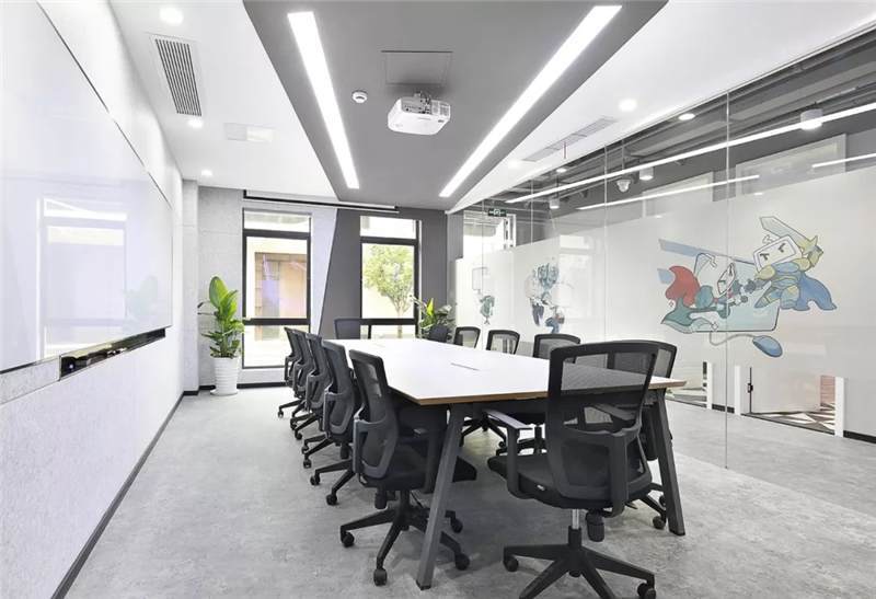 開放辦公區主體用大量的白色,更加干凈、簡潔;頂面燈具使用粉色,與其他區域相呼應;地面采用兩種地膠拼接,也使得空間更加有層次感。大小不同的會議空間設計,運用了天花到墻面再到地面的連貫造型,增加整個會議空間的靈活性。