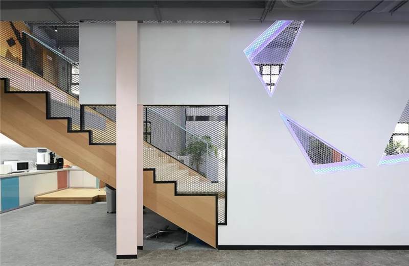 前廳區右側,是直通二樓的木飾面步梯,臺階加寬,高度錯落有致,LOGO藍,粉,灰與原木色相間,這不僅僅是上下樓梯,更承載著員工的休憩與溝通交流功能,因此增強該區域的趣味性。步梯后方和右側吧臺巧妙的設計成一個連貫性的茶水區,吧臺錯落在茶水柜延伸出的區域,搭配綠植,增添生機和活力。