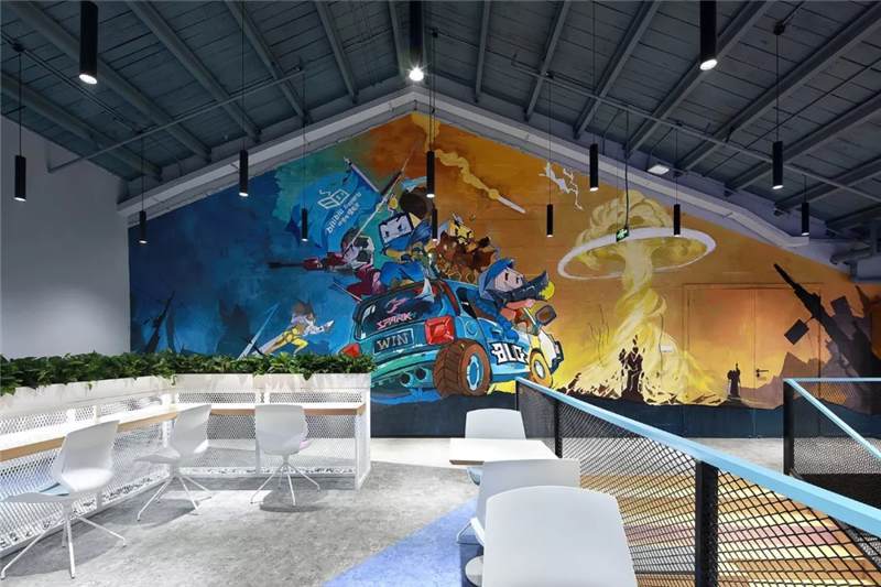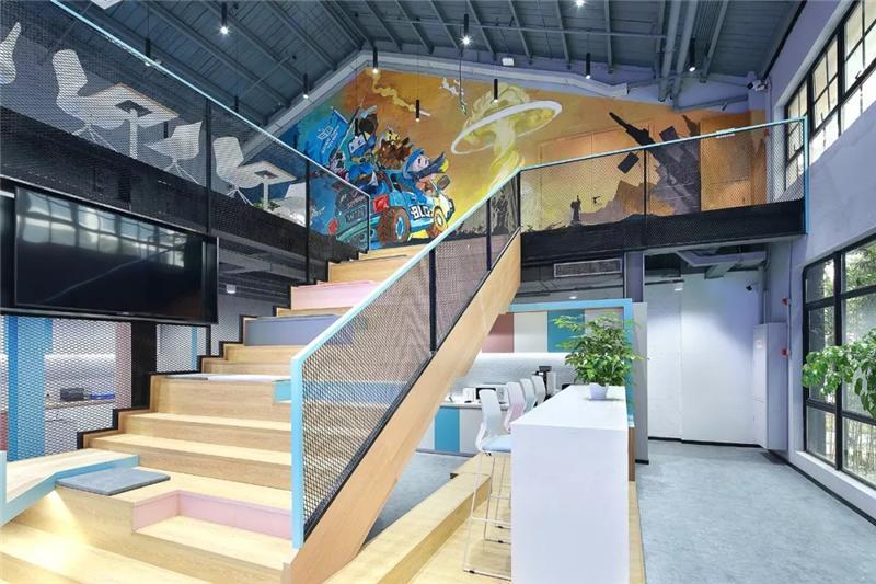 二層大臺階入口處設計師設置醒目的電競主題手繪圖,巧妙的把原本的雙開門變成隱形門,墻內部為電競導播室。手繪圖豐富的色彩,突出的電競主題,卡通的形象,把BILIBILI的風格呈現的淋漓盡致。