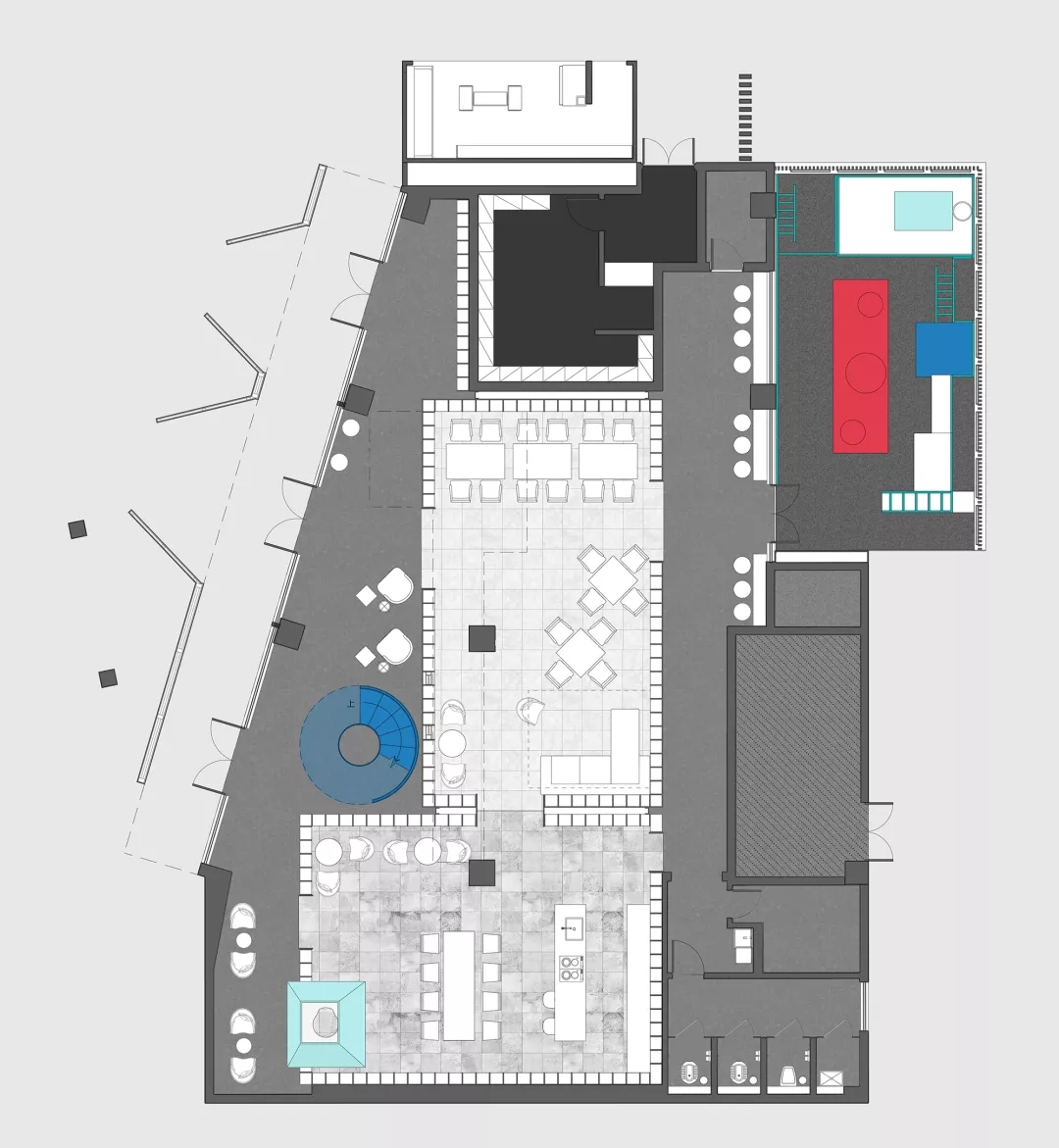 現場是個不規則的平面,如果排除未來可復制性,就著形狀設計并無不可,但這就缺乏了示范性意義。設計師按照客廳研究成果,在這個不規則平面最大極限設置了三個盒子,一個是功能性的,一個是社交性的,一個是女性的。如果把不規則的場地看成是一座城,這三個盒子就是內城,而他們之間不規則的剩余空間可以自由定義的場所。