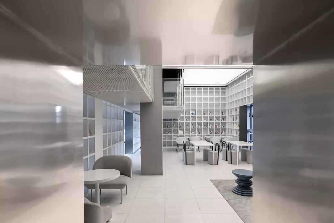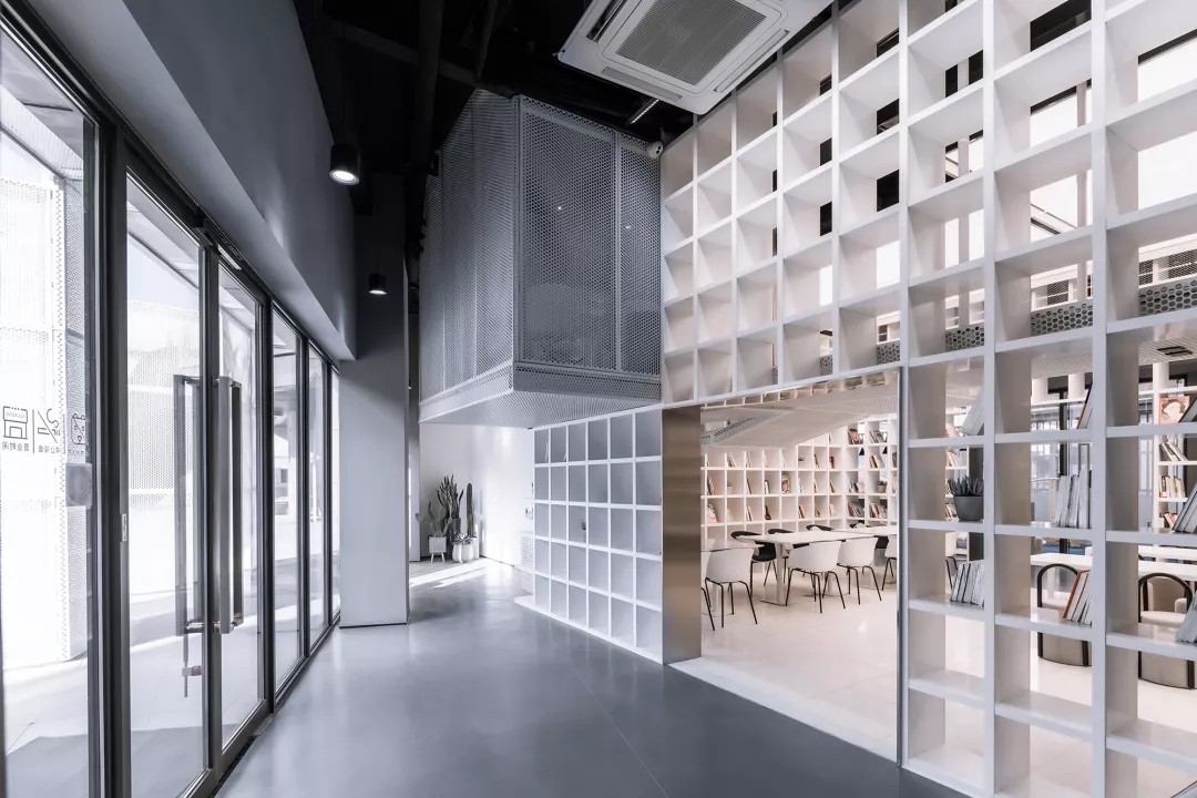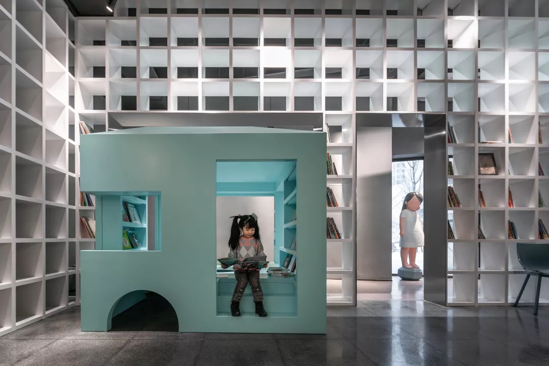We make the reading room with Tiffany Blue as the core of the Female Box in response to the spiral staircase with Klein Blue at the entry, as well as the external kid’s area with bright yellow color at the back of the box.This community living room would be just a cliché and lose its function of demonstration if it was hidden inside of a commercial space. Youkong Living Room is more like an opening box on its façade. The four-meter high semi open entrance is made of perforated aluminum panels, which is a representational move of Wutopia Lab that from there you can see warm and gentle lightings, bright blue colors and kid‘s laughter.
