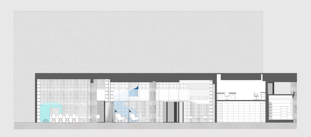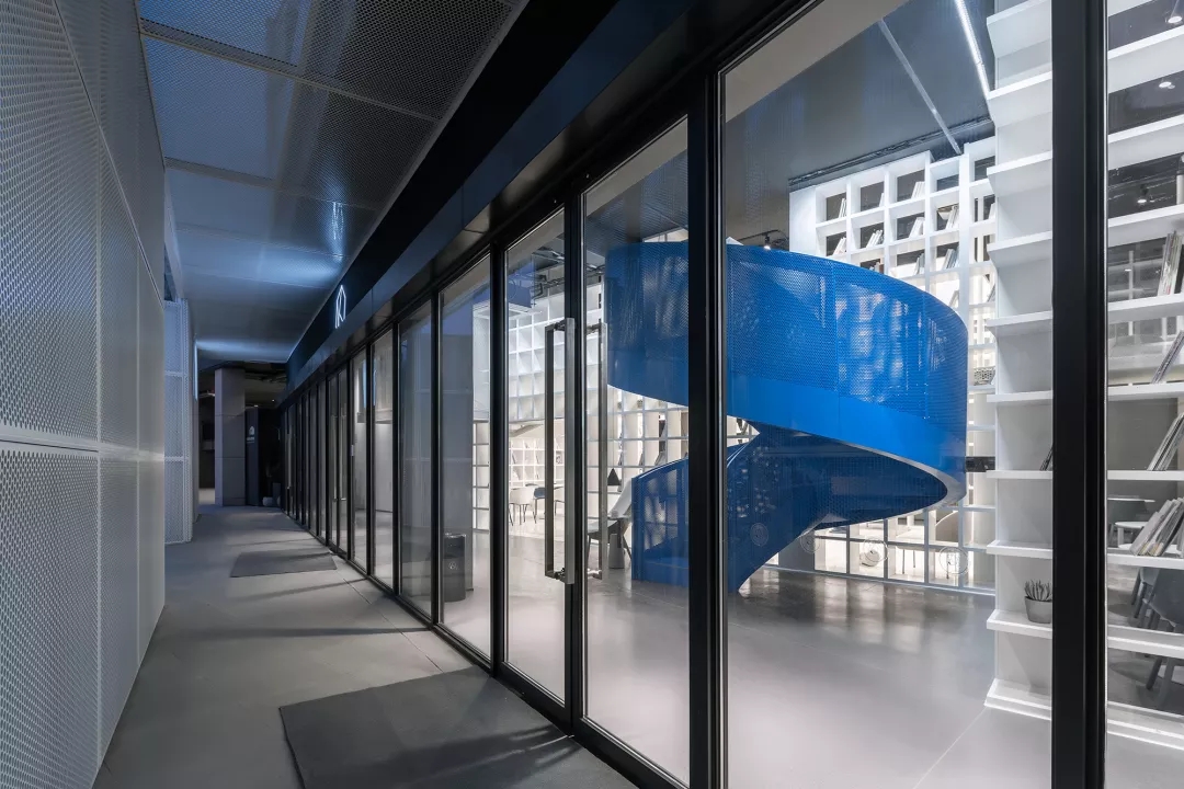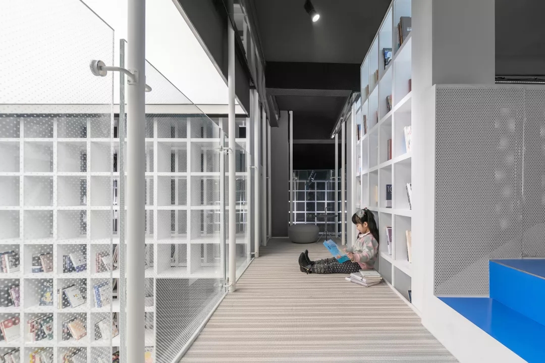 我用蒂芬妮藍閱讀屋作為女性盒子的中心,與此呼應的是入口可見的卡萊茵藍螺旋樓梯,以及盒子背面室外的明黃色兒童活動場地。他們精致地鑲嵌在有些迷離模糊的空間中成為點睛之筆。如果社區客廳藏在陳詞濫調的商業里面之后,就失去了示范作用。有空客廳的立面就是一個打開的盒子,高4米的半開門是穿孔鋁板制作的,形成了Wutopia Lab標志性的半透明界面。你能從這里隱隱約約的窺看到,溫暖的燈光,明亮的藍色,和孩子的笑聲。