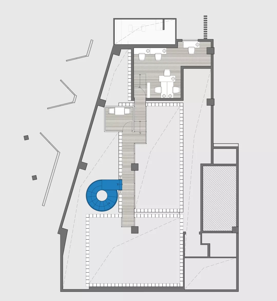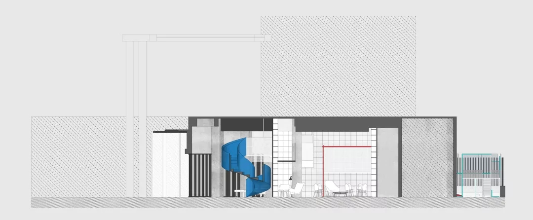 我們設計了一個夾層走廊隱藏在書架上.在課題研究中如何利用層高一直是房產商關心的,以我的實際經驗,凈高2.1米仍然具有一定舒適度。在本案中,原本懸在社交盒子上的麻將房因為一樓層高過低無法成立,于是我們直接切斷,形成一個小陽臺作為暗示。