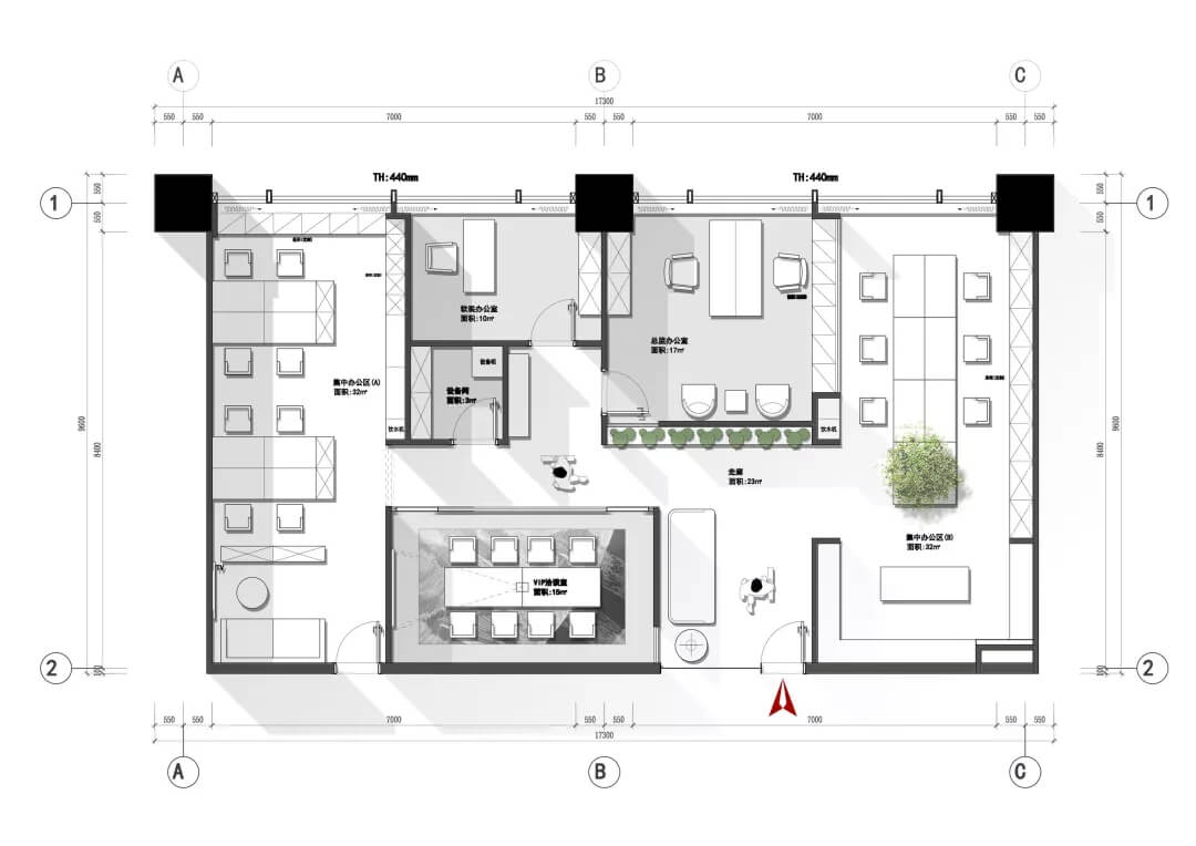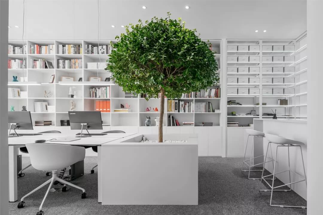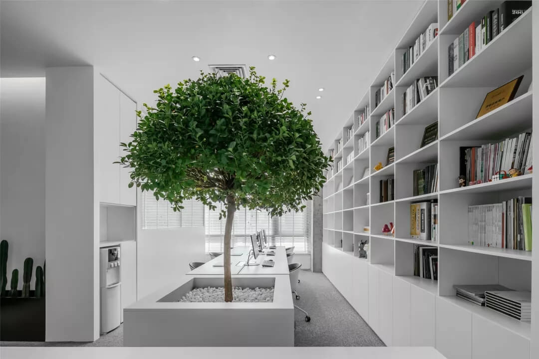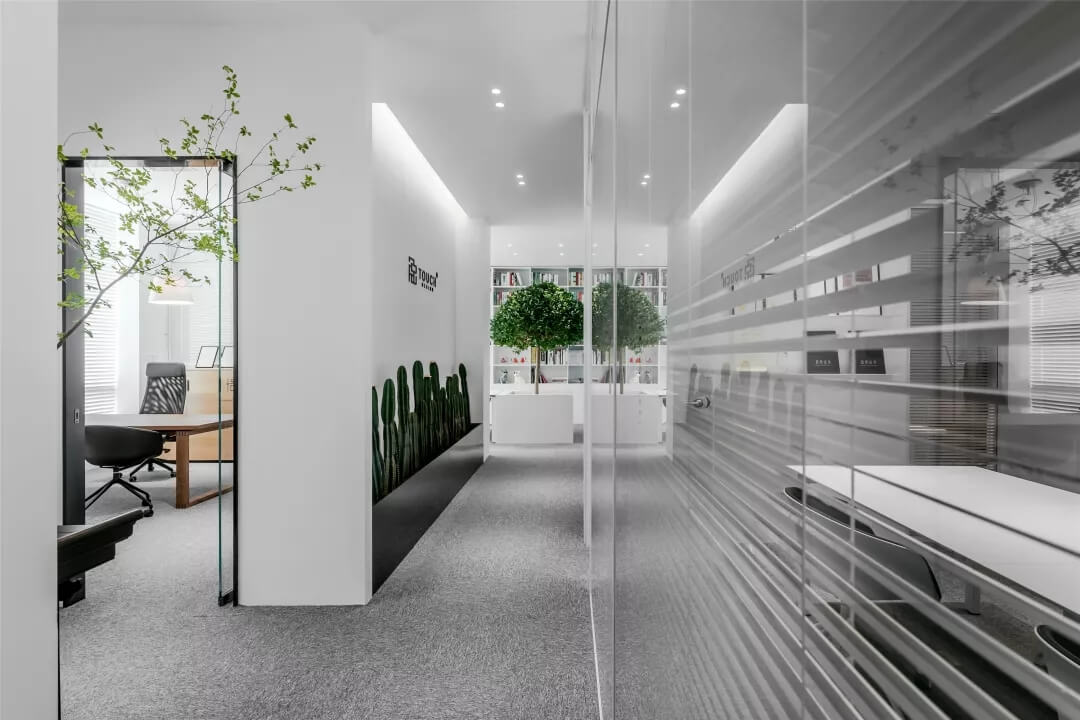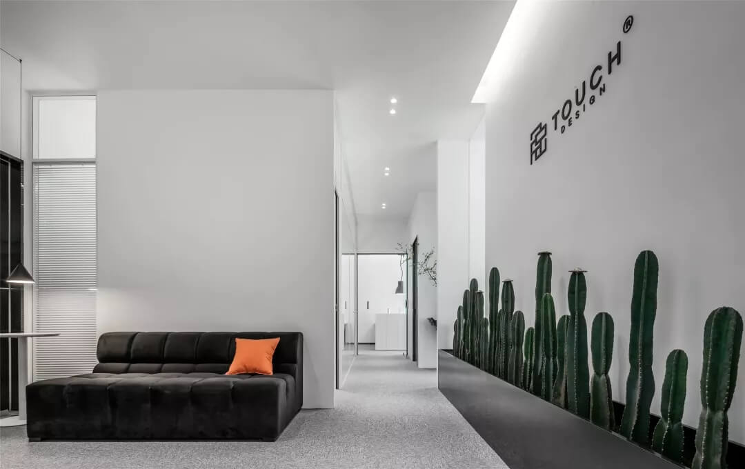 刪繁就簡,以最經典的白色為主題搭配色調,沒有繁瑣的辦公室設計和過多的裝飾,減去辦公中的壓抑感。通過將自然純凈的白色與沉靜黑色相結合,將品牌形象簡潔地呈現表達,同時為左右空間的過渡創建和諧觀感。純白的墻面,接近心靈的澄凈;仙人掌是視覺的焦點,恣意生長、堅韌、夯實根基,也正寓意著公司的設計理念:有所依、有所仗、有所長。