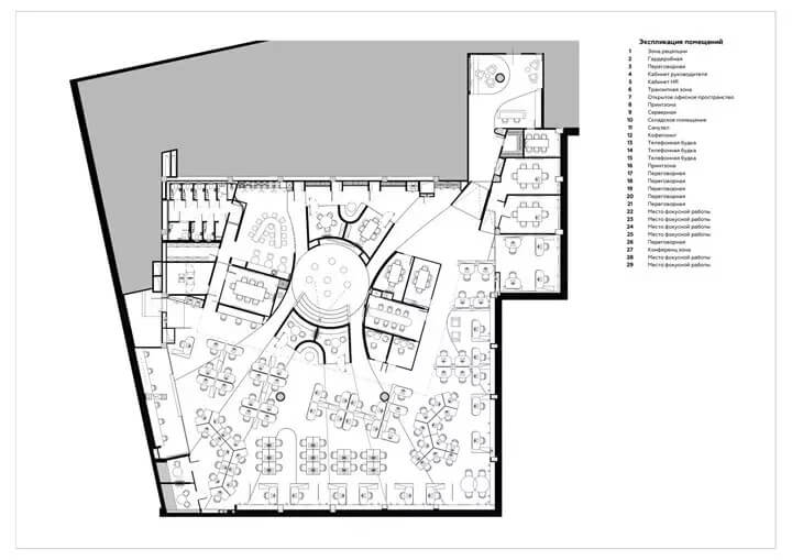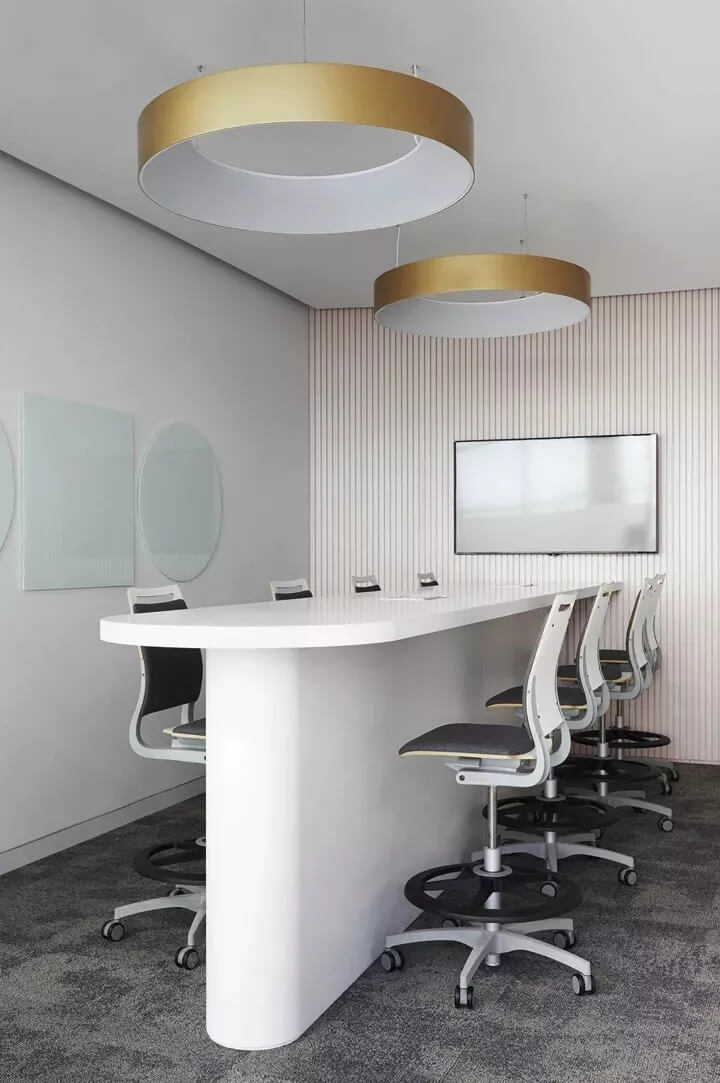 計概念的靈感來源于公司的名稱——L'or(法語,意為gold金色)和aurele(法語,意為halo光環)。“金色光環”的品牌寓意成為整個空間形式的構造背景,整個辦公室的主動線也圍繞著一個圓環來規劃。這個中心圓環被定義為一個明亮的核心空間,形成一個中心會議大廳,周邊分布著或開放或封閉的會議區。