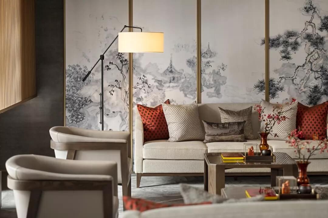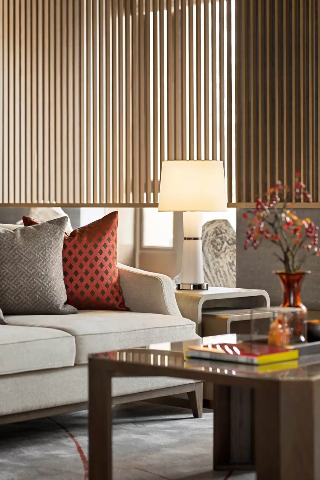 屏風上“高山流水遇知音”,宛如在娓娓道來伯牙子期當年的故事。收藏級裝幀叢書,代表禮儀身份的印章,抱枕上的祥云、山水刺繡,細致精巧的陳設烘托出文人雅趣,同時營造了沉穩靜逸的氛圍,堅定地表達了現代東方的美學態度。
