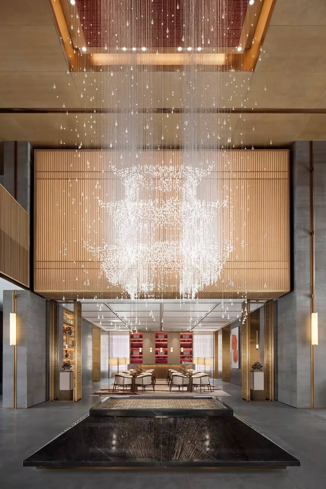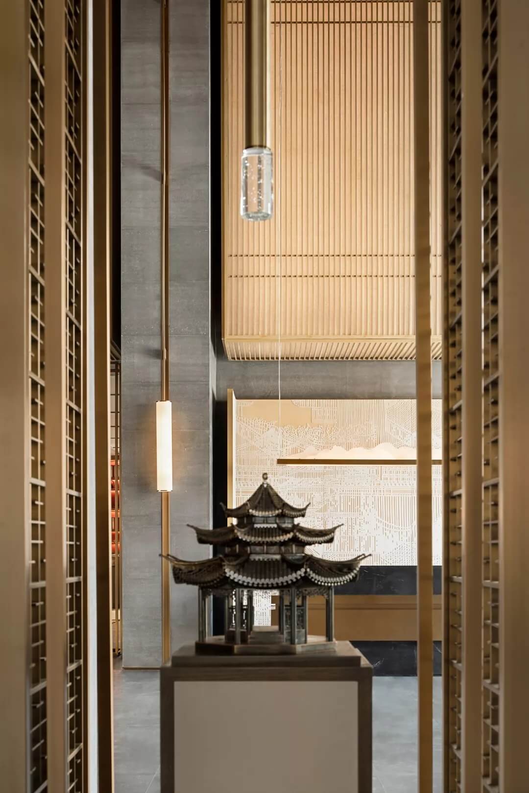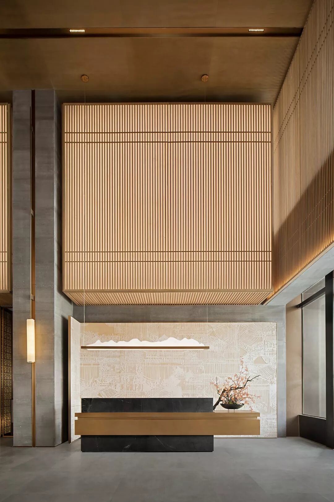 踏入第一重空間的迎賓前廳,大堂挑空高7.7米,氣勢恢宏。“甲第者以禮為官也,不學禮,無以立。”為此,迎賓區的設計干練簡潔,以飽含的禮儀序列拉開整個空間的序幕。