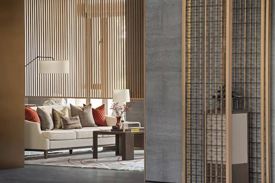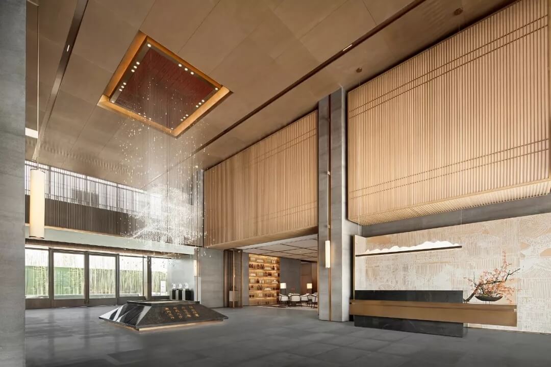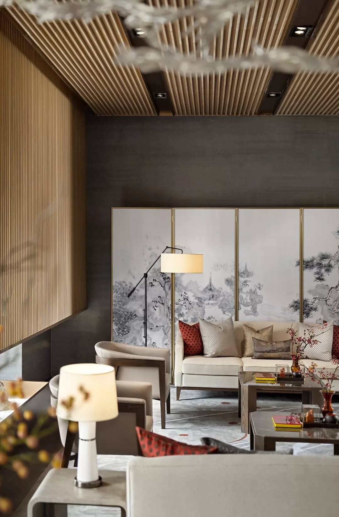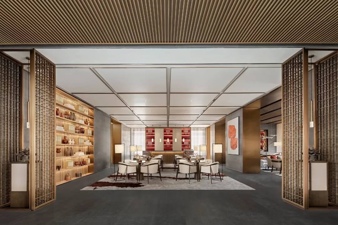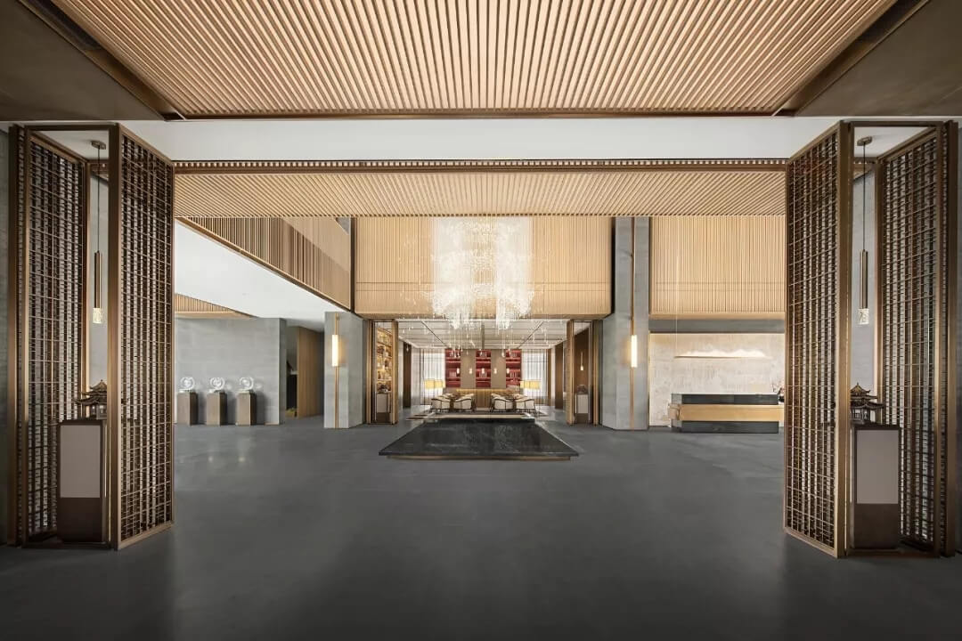 踏入第一重空間的迎賓前廳,大堂挑空高7.7米,氣勢恢宏。“甲第者以禮為官也,不學禮,無以立。”為此,迎賓區的設計干練簡潔,以飽含的禮儀序列拉開整個空間的序幕。