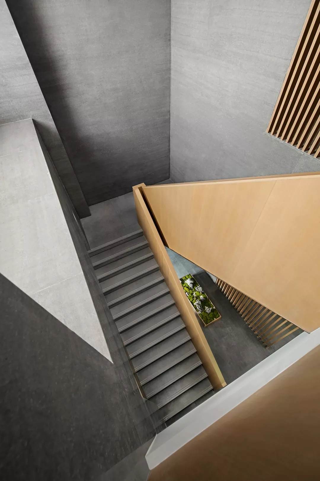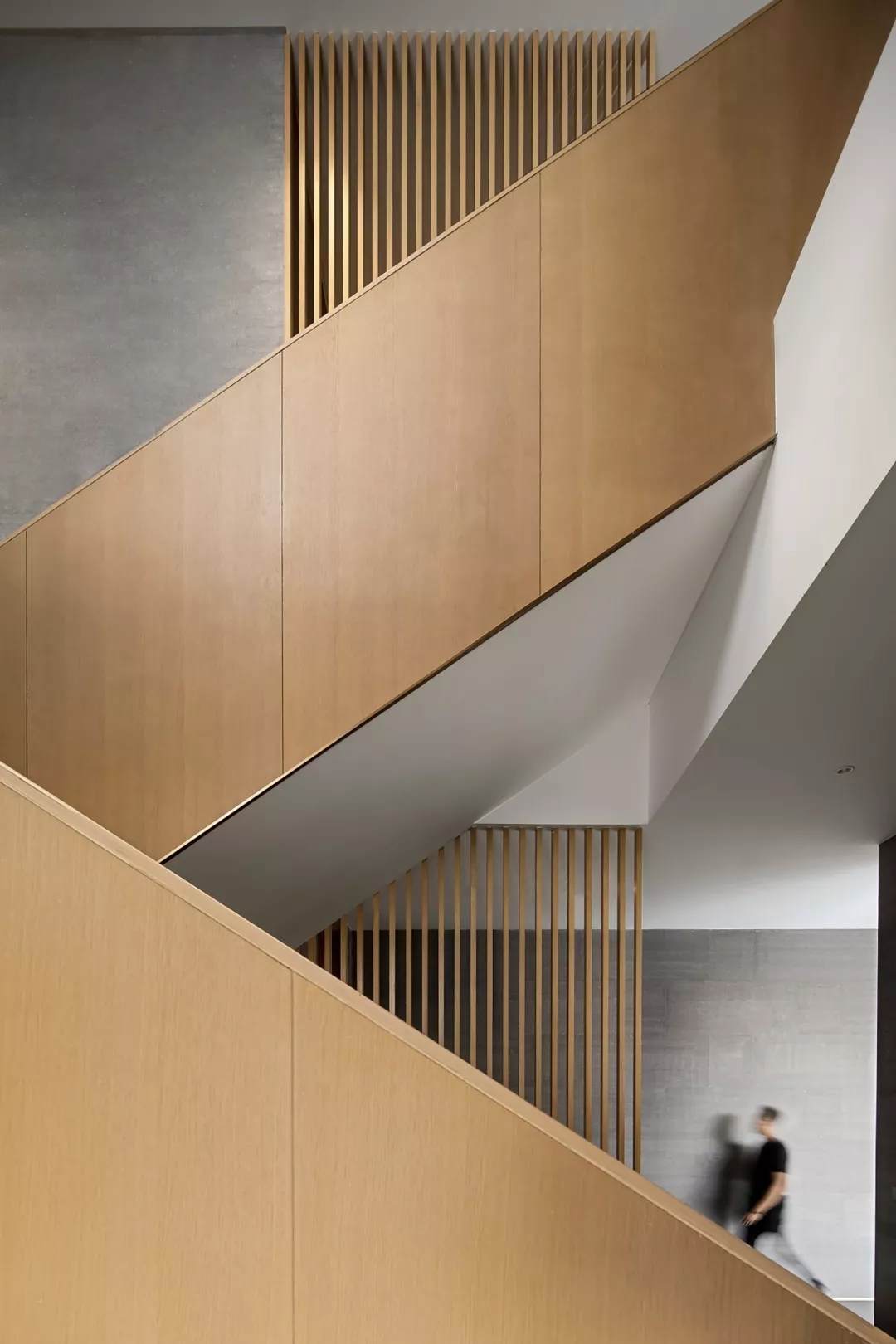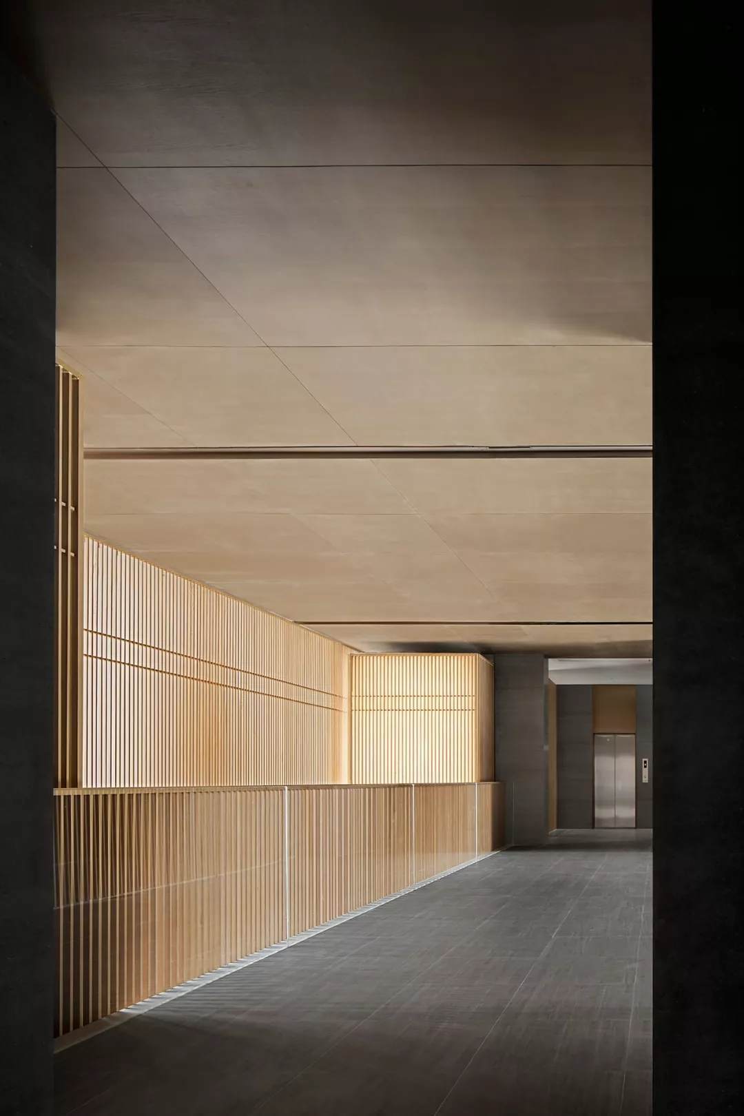 考慮到實用性與安全性,空中連廊處以玻璃扶手作為有力支撐,外圍予以木格柵裝飾,整體用色克制統一,在極具秩序感的光影里,彰顯了設計師一貫簡約純粹的風格。