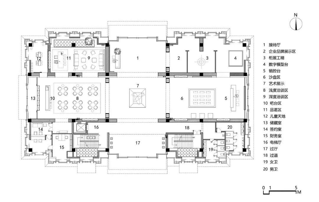 印、屏、紋可謂官宅元素的重要載體,在中國文人的生活中占據著重要的地位,彰身份,寓雅趣,更是“第”之名的具象化表現。沙盤區則是這三項元素最有力的映射與例證。木格柵因勢延續至此,銷控臺主背景及金屬陣列屏風則滿載印章紋案,以純粹統一的手法、元素來塑造其干練有序的風貌。