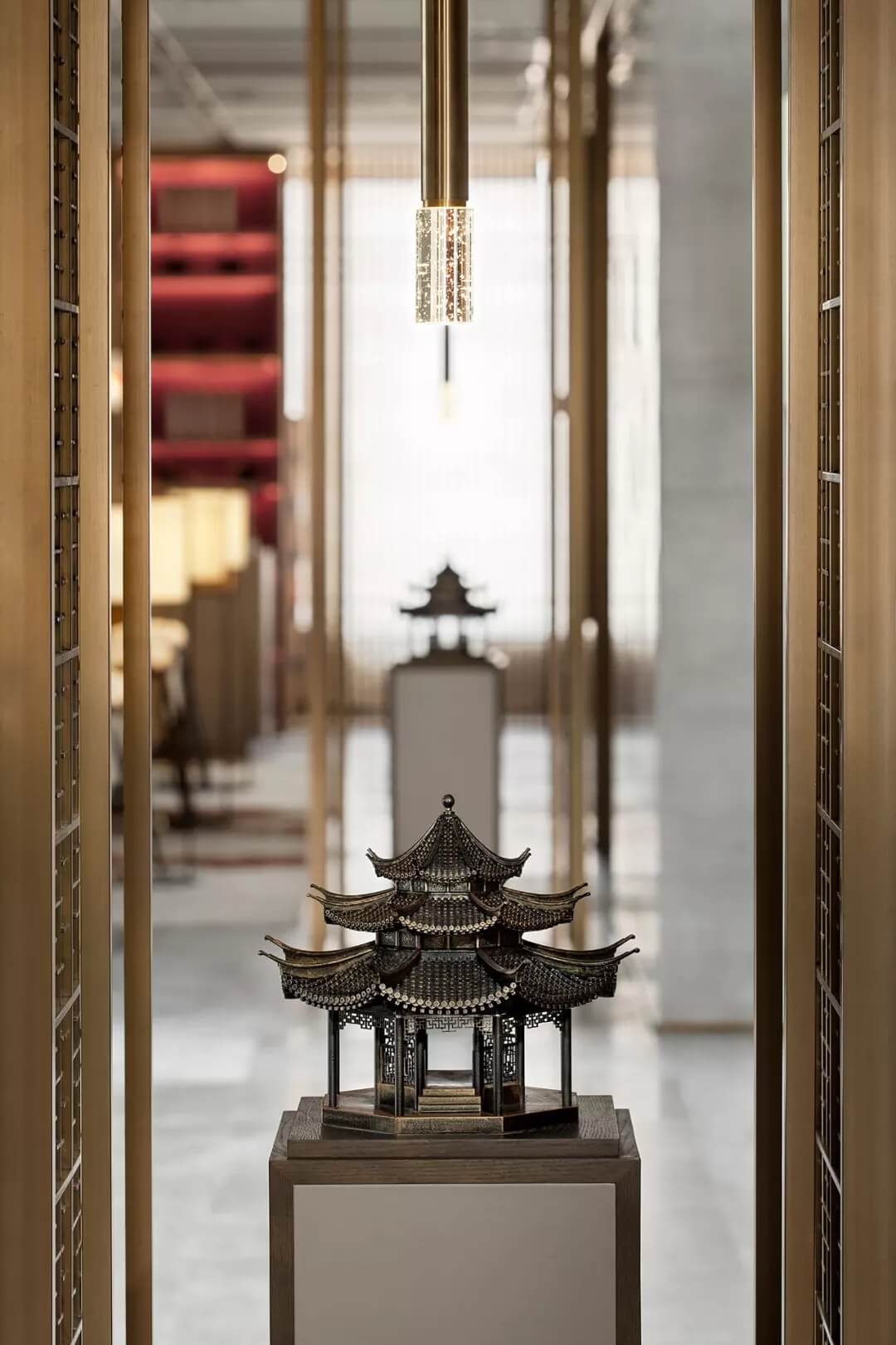 此外,八角亭作為官宅的建筑小品,自然也是不可或缺。設計師將黃鶴樓前的八角亭植入室內,運用3D打印技術,表面作特殊的工藝處理,實現古銅金屬材質的表達,詮釋出現代與傳統、傳承與發展的融合。