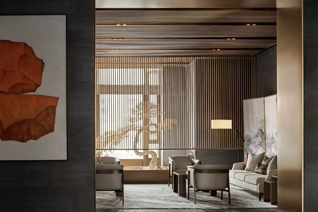 緊鄰淺度洽談區的一側,設立深度洽談區與品茗區,在半開敞半私密的復合型布局中,木格柵材質以橫豎并存的姿態出現,更具韻律節奏。此外還引入園林造景技法,虛透中亦可一窺山石松林,領略到“窗前有風景、心中有山水、茶中有天地”。