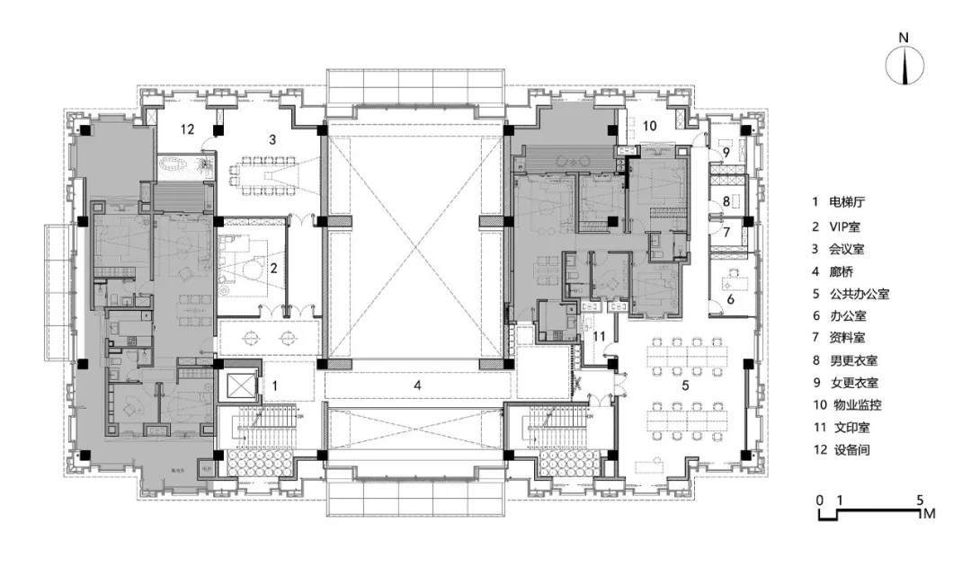 內部橫軸與縱軸兩條動線交叉,劃分出方正規整,卻又充滿開放互動式的功能分區,這也是官宅建筑的題中之義。縱軸動線上的兩側墻體向中心處略作延伸,上方木格柵內包裹燈箱一體貫穿而成,下方則以金屬屏風陣列來開啟兩端分區的儀式感。在燈箱、屏風的逐層隱退與縮進中,打破了空間的單調與空曠,立面視覺更加莊重大氣。