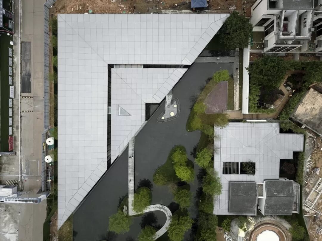 同時,整個建筑運用了現代構圖的方式,突破了傳統對稱的客家建筑特征,將多個同心半圓演化成多個相似三角形,構成了不對稱的幾何空間;巧妙地通過線與面的緩急對比加強了視覺上的層次感,以不同的設計手法,在保持建筑與外部交匯貫通的關系的同時,強化了建筑的縱深感。