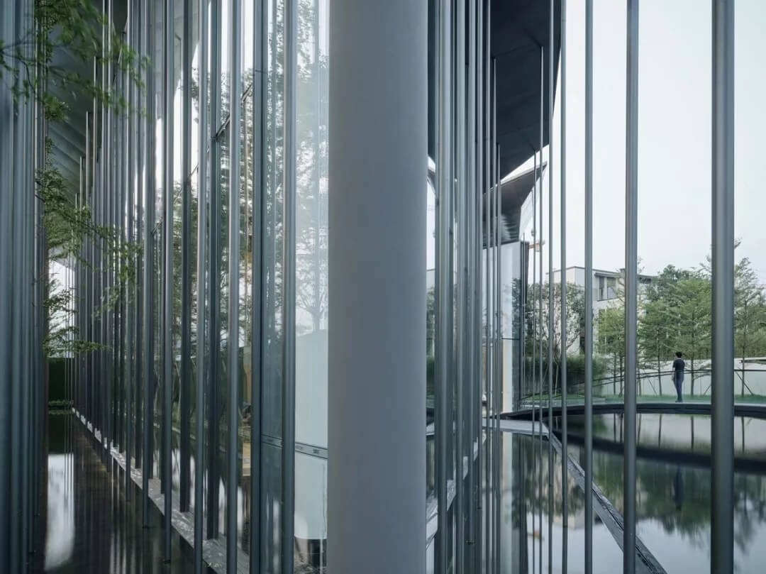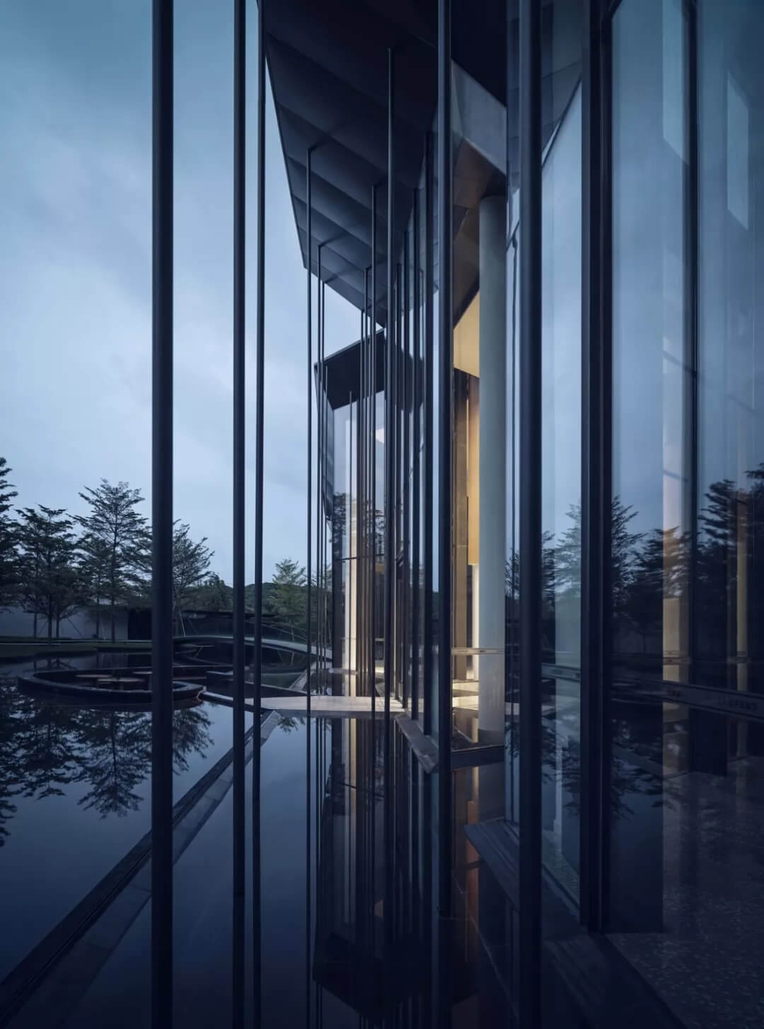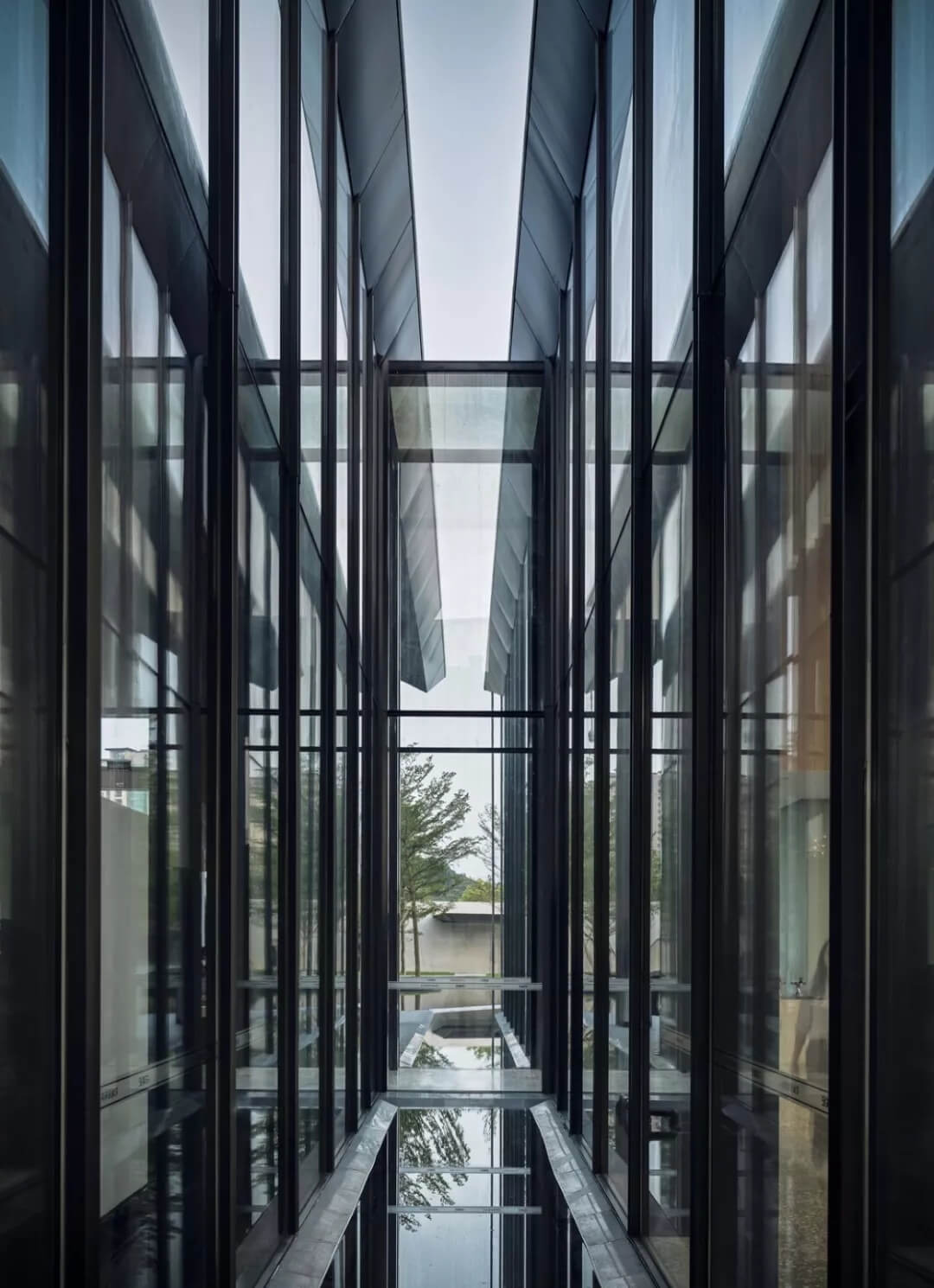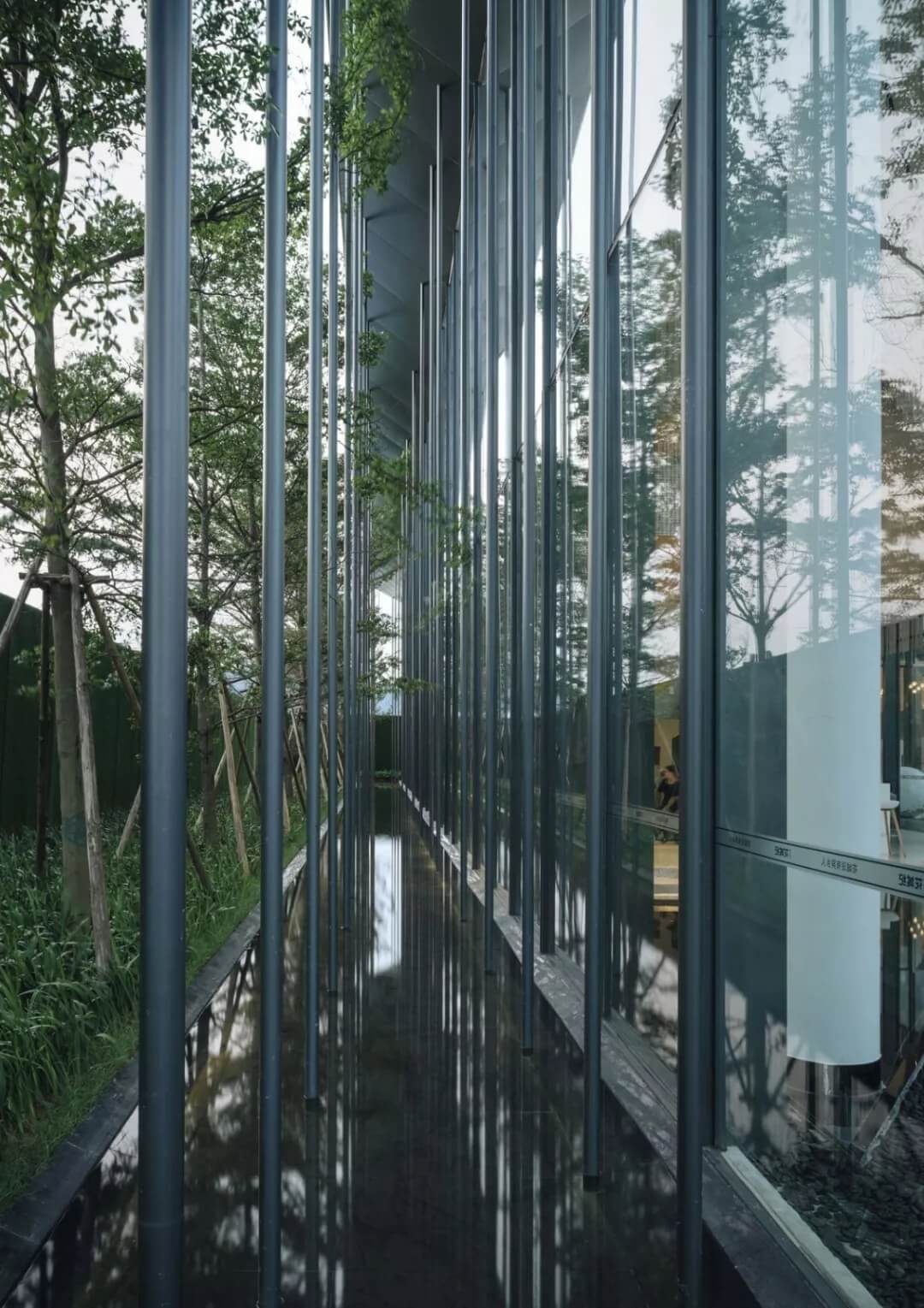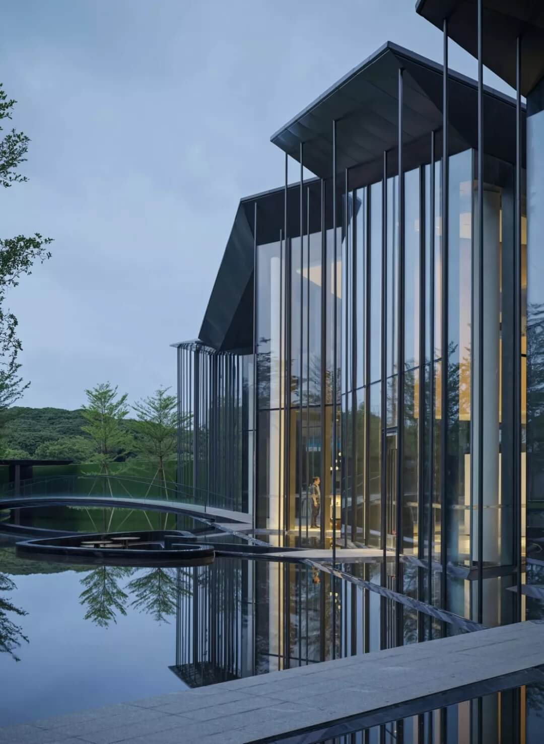 在這個項目中,建筑師嘗試用現代的理念、結構和材料來打造由封閉走向開放融合的客家建筑,創造出傳統文化和現代觀念相結合的建筑形態。如同客家建筑大多坐落于山水樹林間,這座雙層建筑與周圍自然景觀也保持著親密聯系。剪影式的三角形頂棚如同山的影子般遮蓋著地面;而支撐著整個三角屋頂的金屬柱廊宛若茂密的樹林,與戶外的樹木連成一片;環繞場地的水景弱化了由剛性的幾何平面帶來的疏離感,大面積的玻璃的應用,引入周圍綠色景觀,重新定義了建筑與周邊的環境關系。莊重但不厚重的頂棚,高聳錯落的柱廊,通透的落地玻璃,山與樹與水。