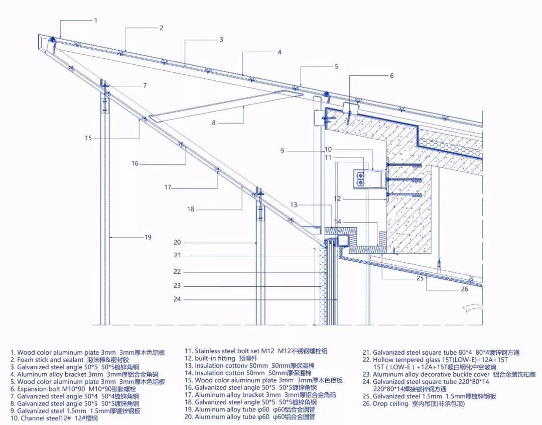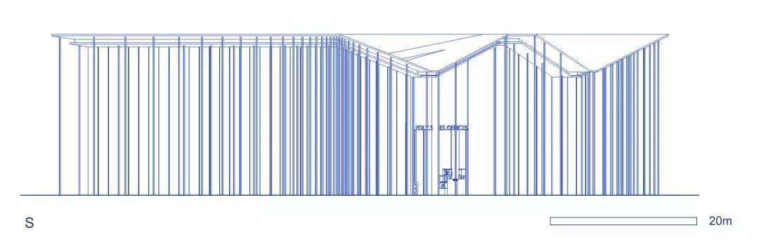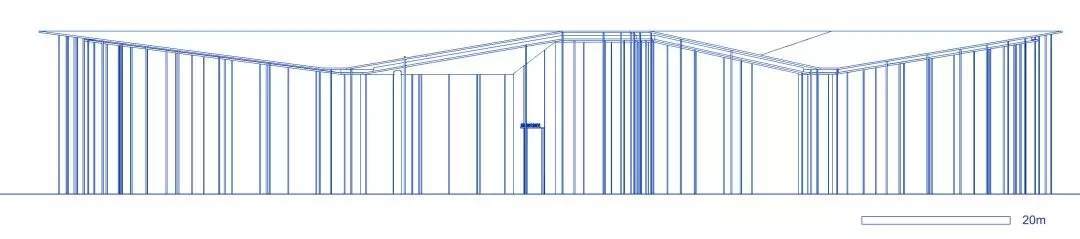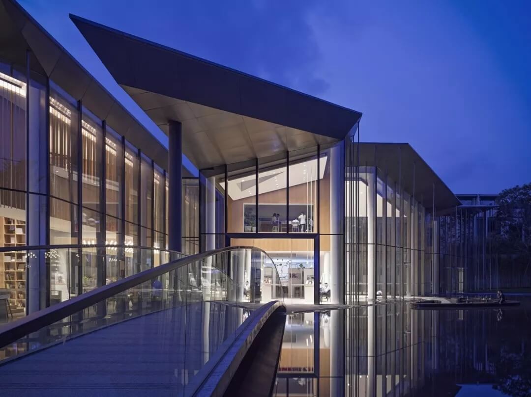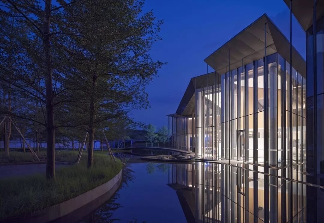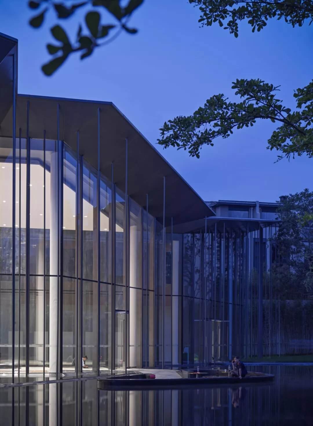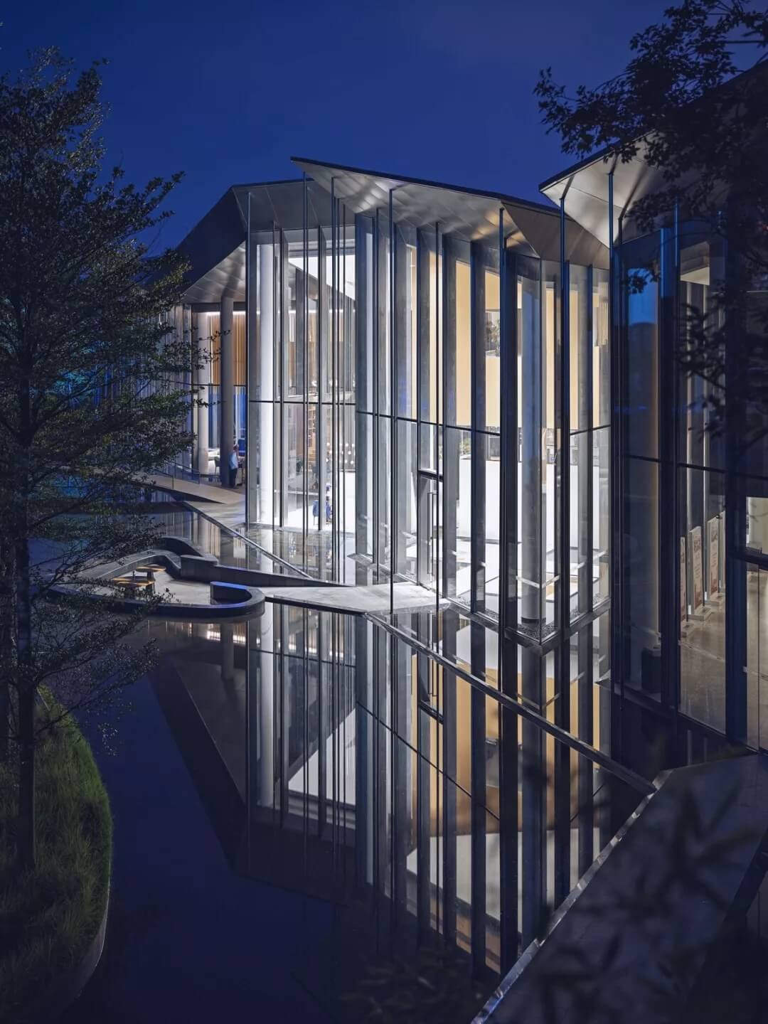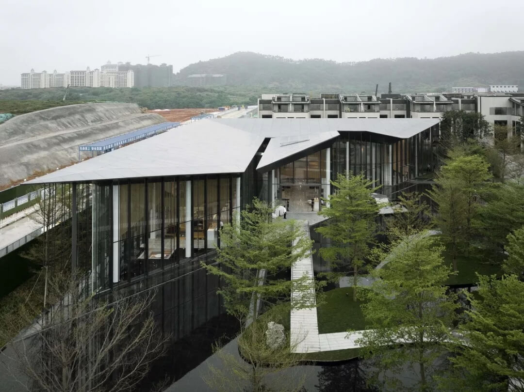 在這個項目中,建筑師嘗試用現代的理念、結構和材料來打造由封閉走向開放融合的客家建筑,創造出傳統文化和現代觀念相結合的建筑形態。如同客家建筑大多坐落于山水樹林間,這座雙層建筑與周圍自然景觀也保持著親密聯系。剪影式的三角形頂棚如同山的影子般遮蓋著地面;而支撐著整個三角屋頂的金屬柱廊宛若茂密的樹林,與戶外的樹木連成一片;環繞場地的水景弱化了由剛性的幾何平面帶來的疏離感,大面積的玻璃的應用,引入周圍綠色景觀,重新定義了建筑與周邊的環境關系。莊重但不厚重的頂棚,高聳錯落的柱廊,通透的落地玻璃,山與樹與水。