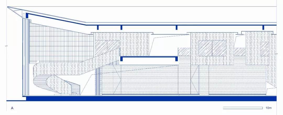 為了適應當地氣候,建筑師在南翼雙層通高的開敞空間內設置了懸垂的木隔柵,可以達到舒適的遮陽效果,并且具有空間劃分的功能。公共洽談區,雙層書架,咖啡吧就位于此。平行垂落且錯落的木隔柵打破了安靜的空間氛圍,和室外的廊柱相互呼應的同時,密布的木隔柵也自身形成體量與二層的功能體塊虛實相生。