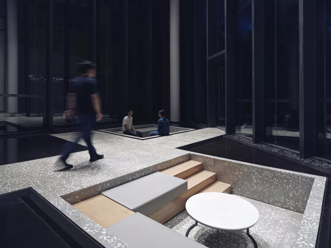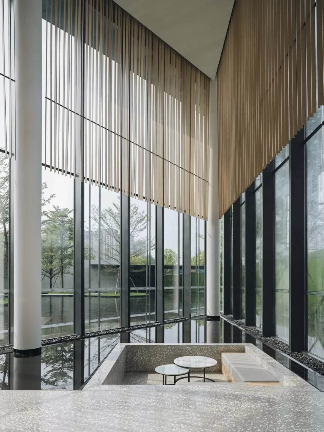 下沉式休息區由外部滲透進來的水體環繞包圍,似客家建筑中的天井,收集儲蓄疏通雨水,淺水鏡面不僅倒映出光影的變化,也將窗外的枝繁葉茂引入室內,營造出人與自然融于一體的環境。