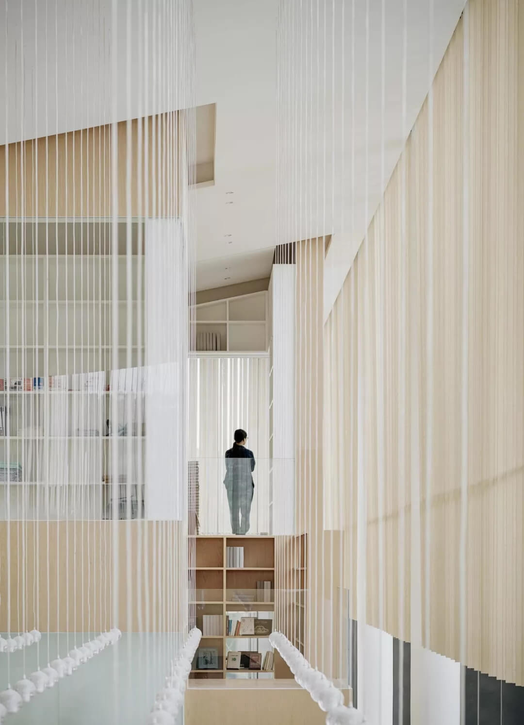 懸挑的頂棚引導游客進入建筑內部,映入眼簾的是錯落分布著木質懸浮盒子的雙層十米挑高空間。同時大面積的玻璃幕墻營造的通透感,使得無論哪個方位,都具有內外空間相通的視覺體驗。隱藏在水池中的下沉休息區,懸掛在天花上的木隔柵,穿插在旋轉樓梯和書架之間的休閑洽談區,還有較為隱蔽私密的二層貴賓室,多個不同功能的空間仿佛彼此獨立,卻又渾然一體。