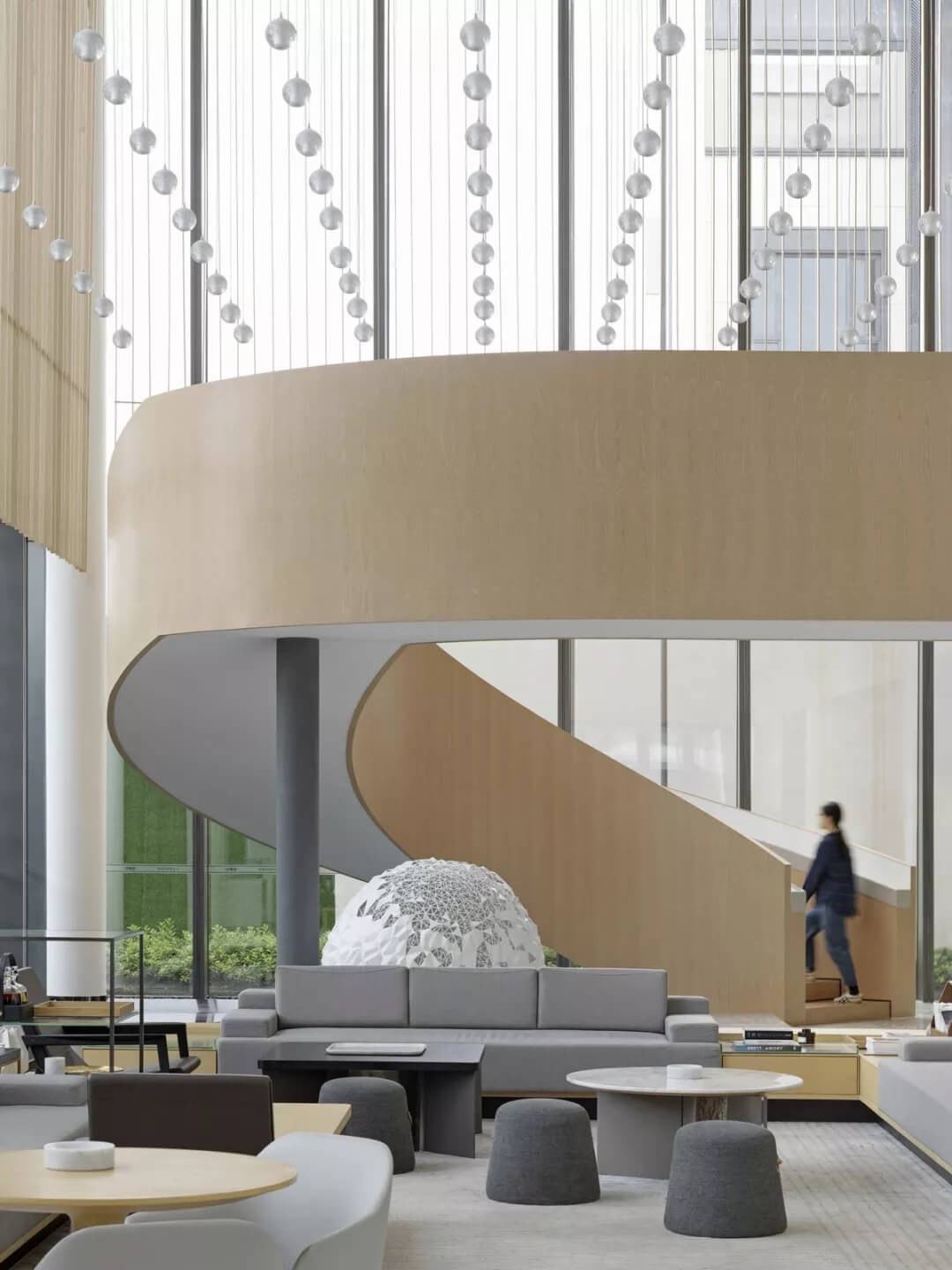 主要的休閑洽談區域通過強調垂直上的縱深感和透明度,營造出一種平穩而開放的空間氛圍。與洽談區相鄰的咖啡吧坐落于一個巨大的木質書架旁,書架隨著木飾樓梯一直延伸至二層,繼而連接起相對僻靜私密的閱讀空間。