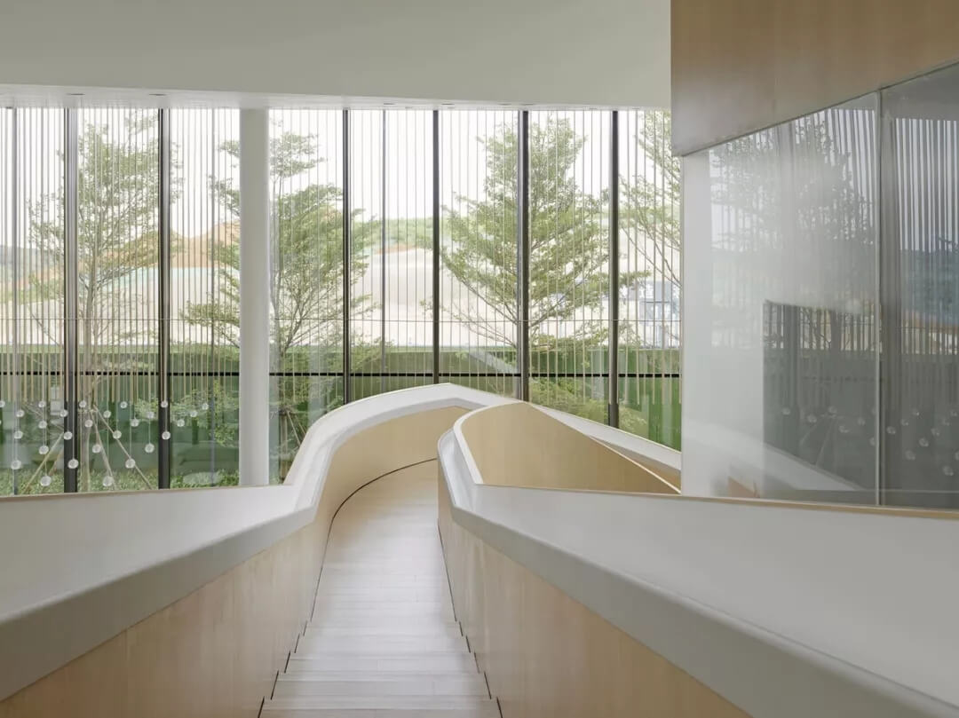 在直線構成的空間中,設計師巧妙地設置了一個旋轉樓梯,經過鋼結構精確的計算,運用了非柱支撐的結構連接于兩層間。游客可以通過此旋轉樓梯到達二樓的貴賓室和辦公室,透過具有框景效果房間窗戶向外望出,看到室內各部的同時亦可以觀賞周邊風景。
