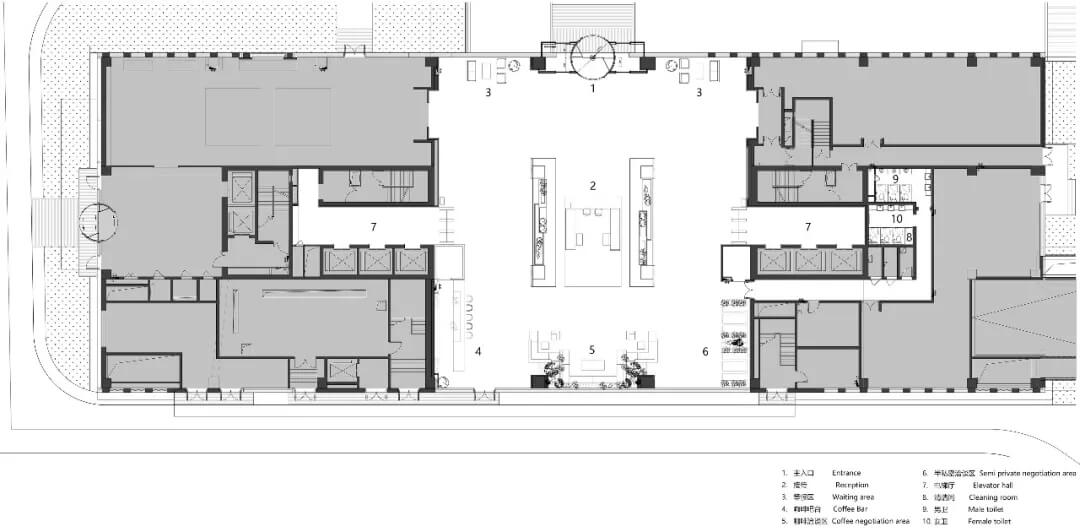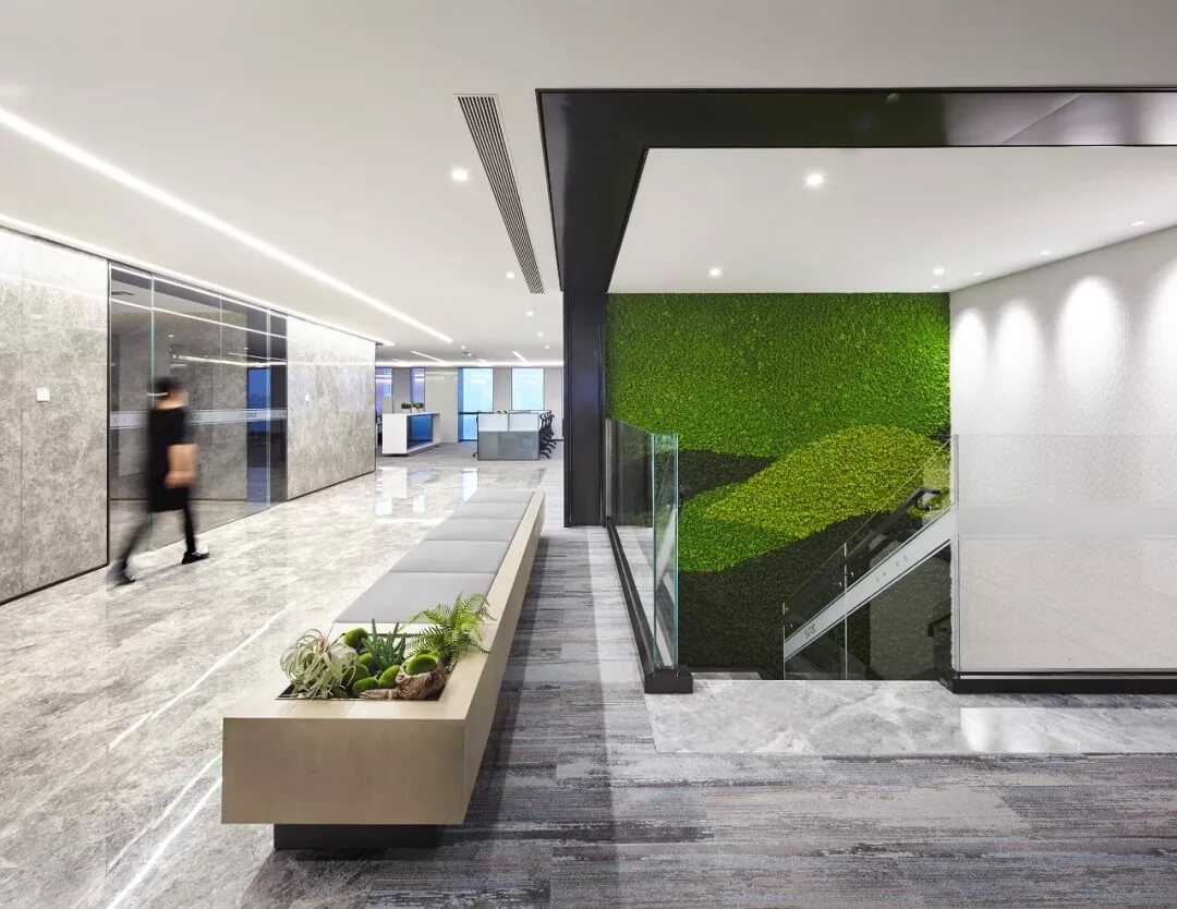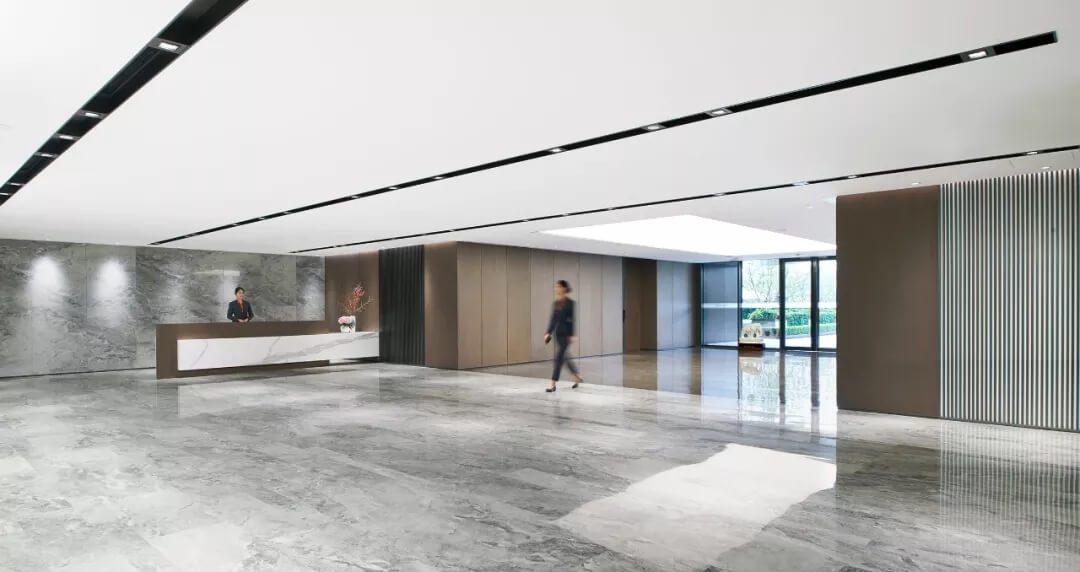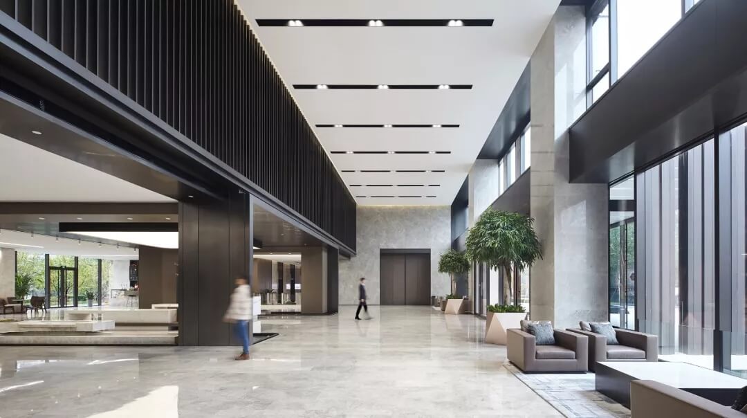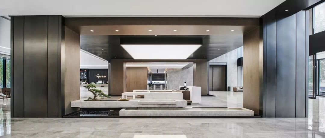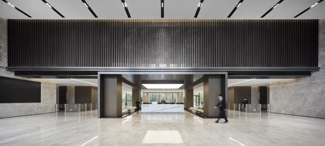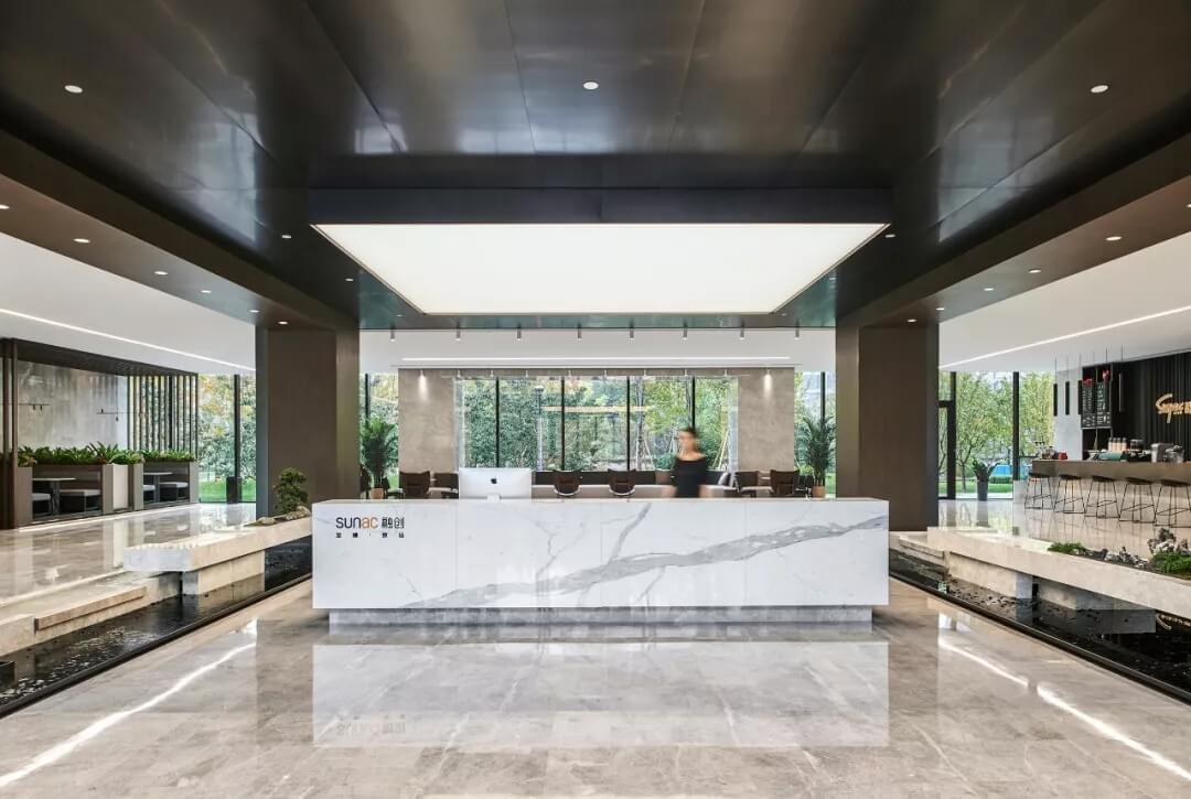 大堂是開放,通透,自然的園林式空間,自成一片天地。踏入大堂即可看到前廳接待島,方形四面通透的造型,嚴謹不失靈活,結合流動水景和盆景,營造了生態的,四季怡情的綠色辦公。電梯廳出入口在接待島兩側,實現快速集散,避免上下班高峰期等候擁堵??Х鹊群騾^玻璃窗形成框景,把室外花園內的四季變幻,自然元素都納入到室內來,形成情景共融。
