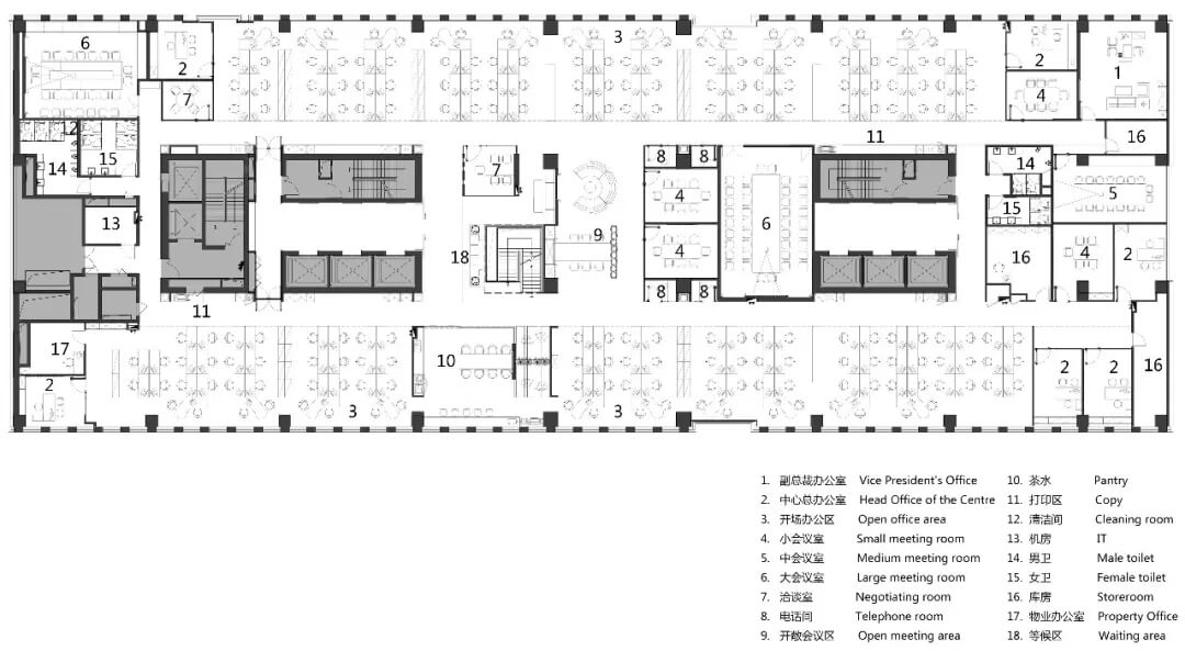 在空間規劃和功能布局上,兩側光線條件良好的區域設置開敞辦公區;核心筒區增設存儲空間、電話間,洽談空間,會議室,滿足各種洽談會議需求;電梯集散口設置樓梯吹拔等候區、茶水區、景觀小品等開放共享和展示空間;采光較弱的中間區域,插入玻璃盒子做會議室。整個平面布局,在原建筑條件基礎上,融合融創需求,級級遞進,相互銜接。