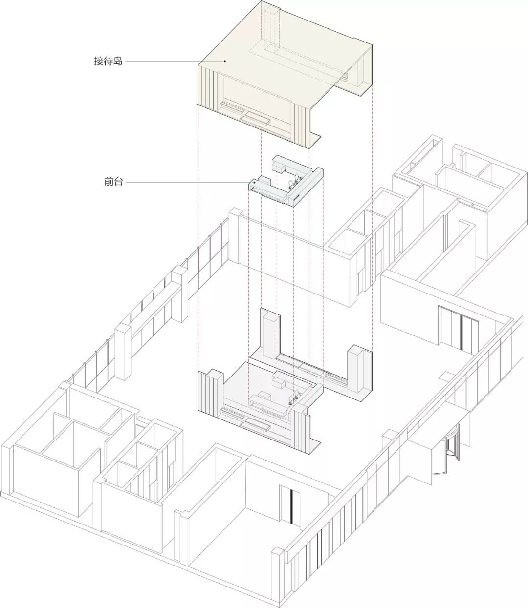 設計師通過空間布局,材料選用等營造出大堂沉靜務實、理性的空間氛圍,咖啡,水聲,盆景,窗外的花園,以及往來的員工,客戶和行人賦予這里靈魂和氣息,使整個大堂充滿各種可能性。