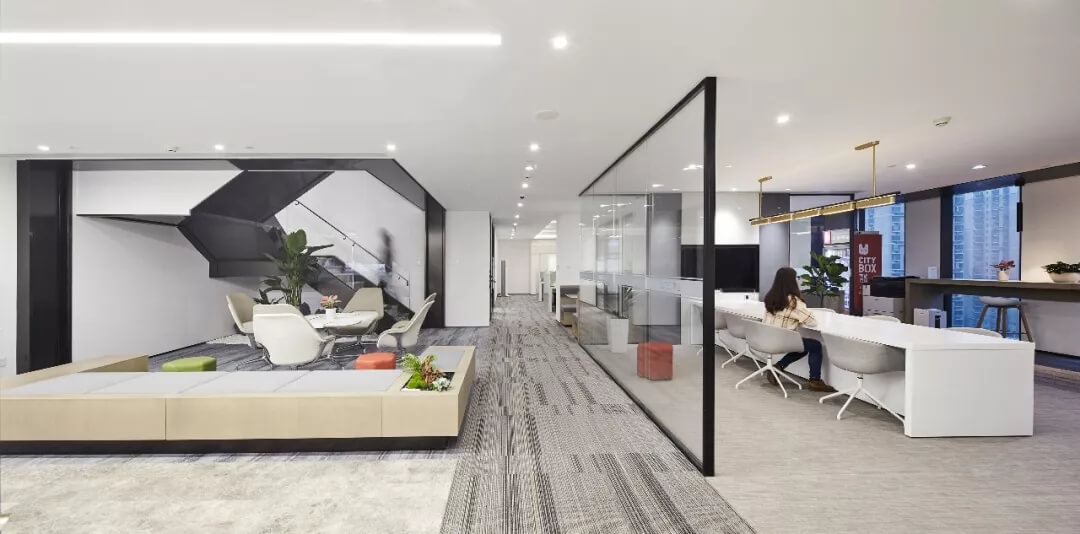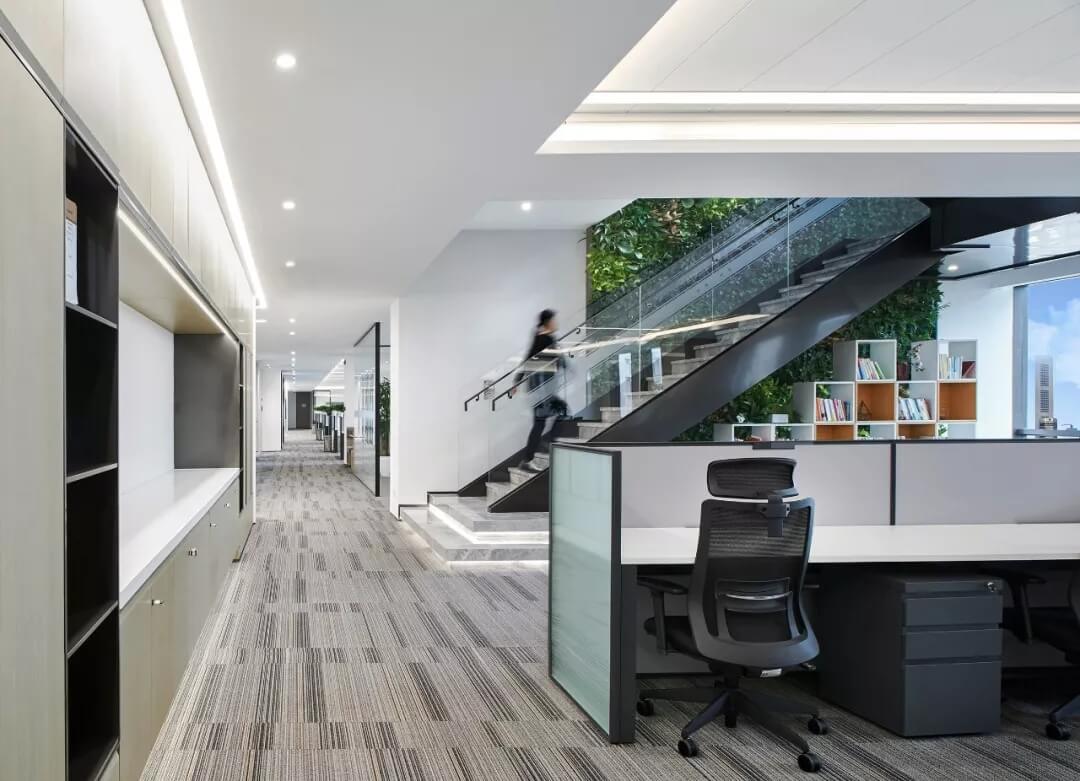 步梯采用極簡折轉的造型和玻璃材質,每層的樓梯區結合景觀設計,聯通電梯入口,茶水間,設置景觀小品,圖書閱讀空間,洽談卡座,等候區等,形成辦公空間的共享交流區和創意生活區,打造有活力,展示性強的員工休閑活動區。