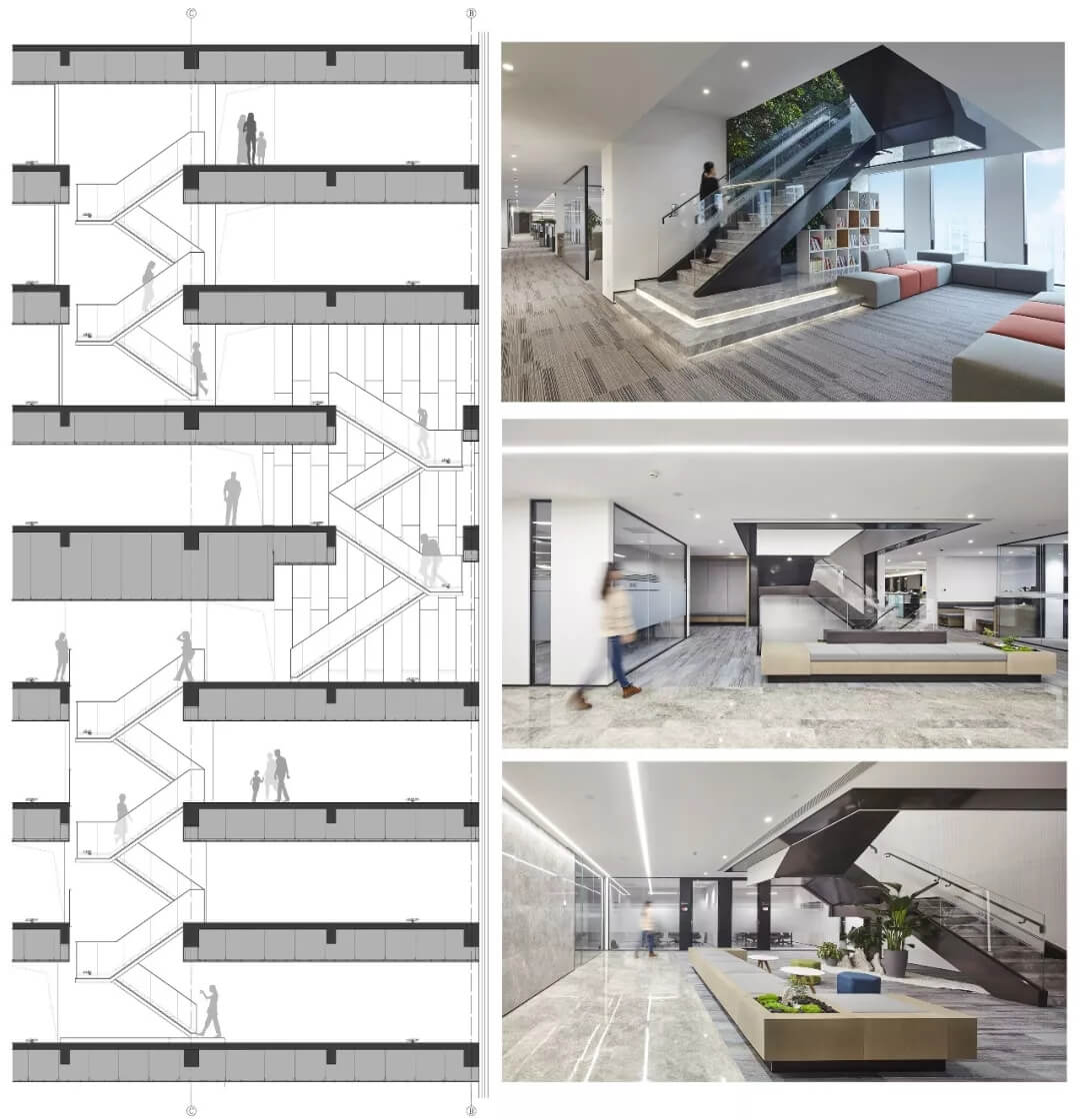 4-11層打通局部樓板增設步梯,增加吹拔空間,巧妙的貫通上下層空間,加速空氣流通,使空間更加靈動透氣,減少空調使用量,同時也使各部門聯系更便捷,溝通更高效 。