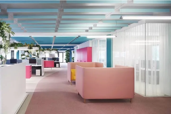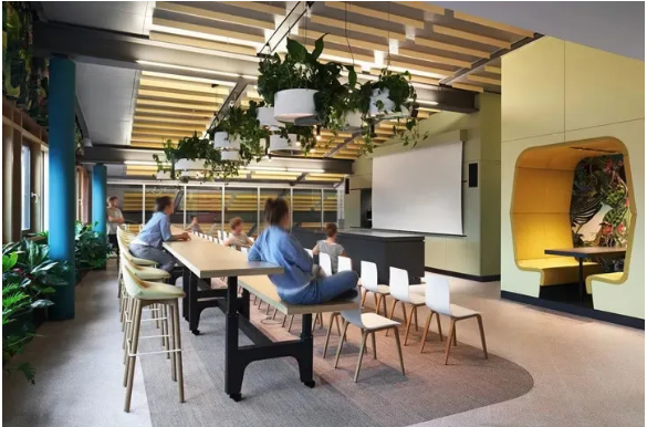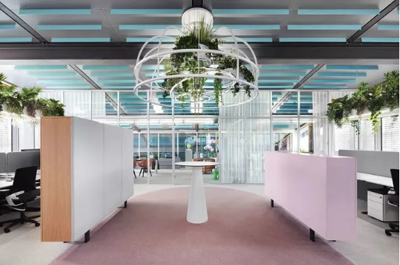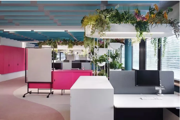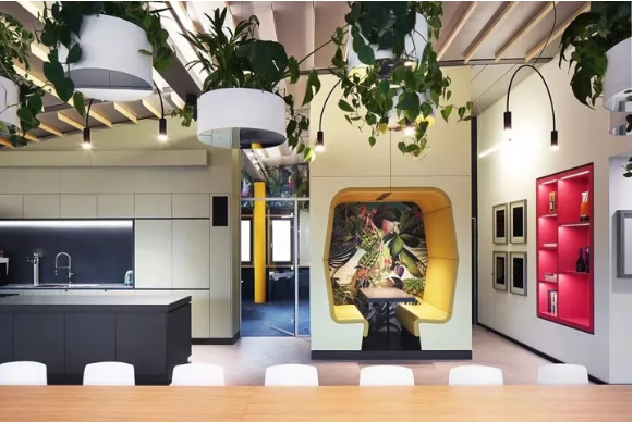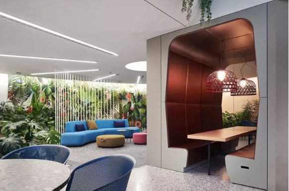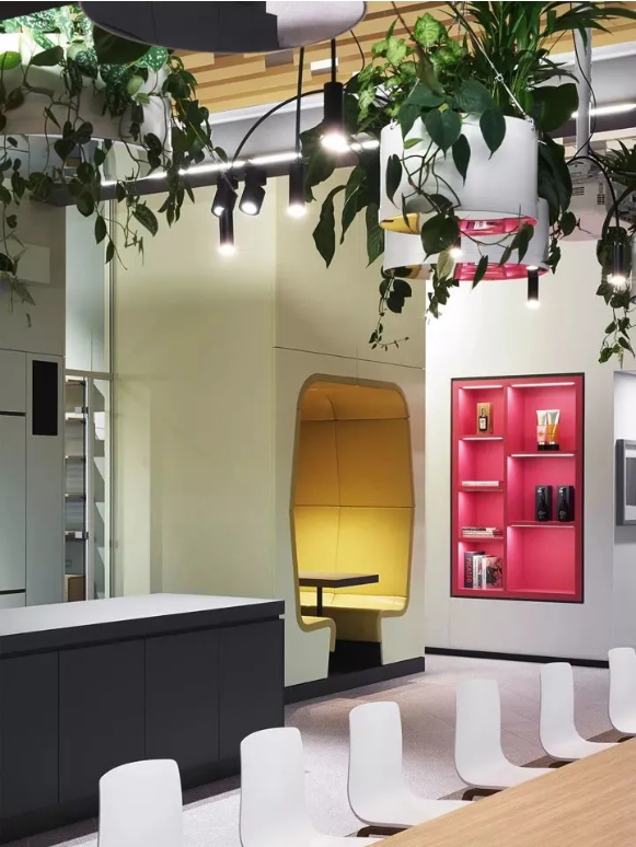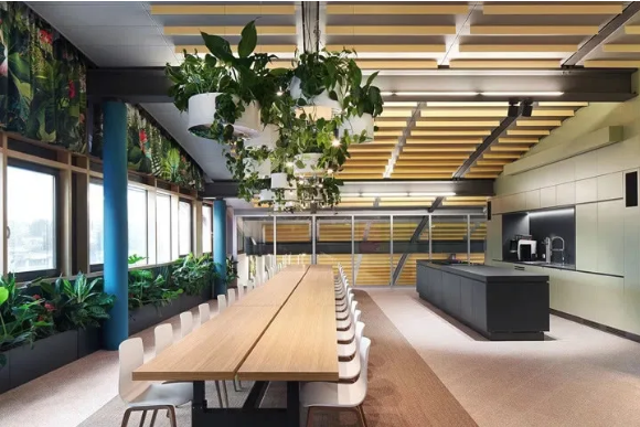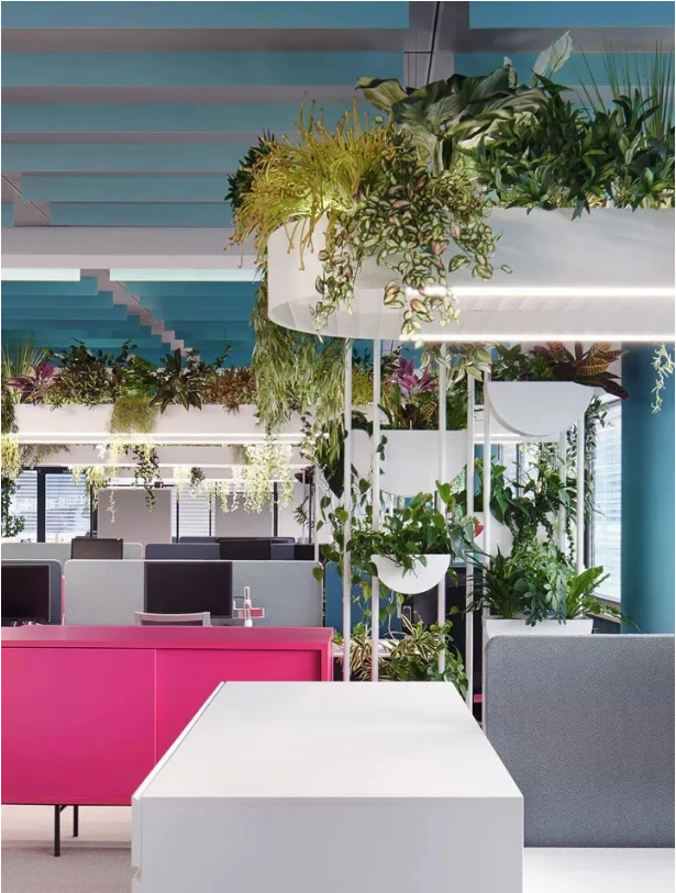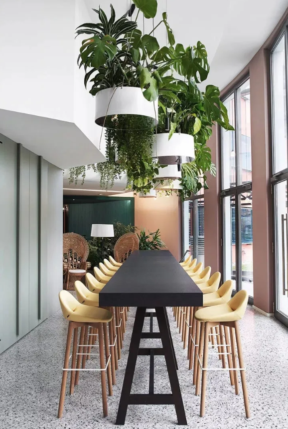 首先,設計團隊為這處工作場所增添了2100個超級盆栽植物。綠植能產生良好的情緒、降低精神壓力、促進創新、提高績效。此外,綠植還能改善空氣質量、營造健康環境,并起到降噪的作用。它們只需定期澆水就能保持茂盛狀態,因此深得人心。室內盆栽植物具有強大的正能量。自從加入了這些綠化,室內濕度不僅從18%增加到44%,讓人們的體感非常舒適,連員工的病假都減少了一半!